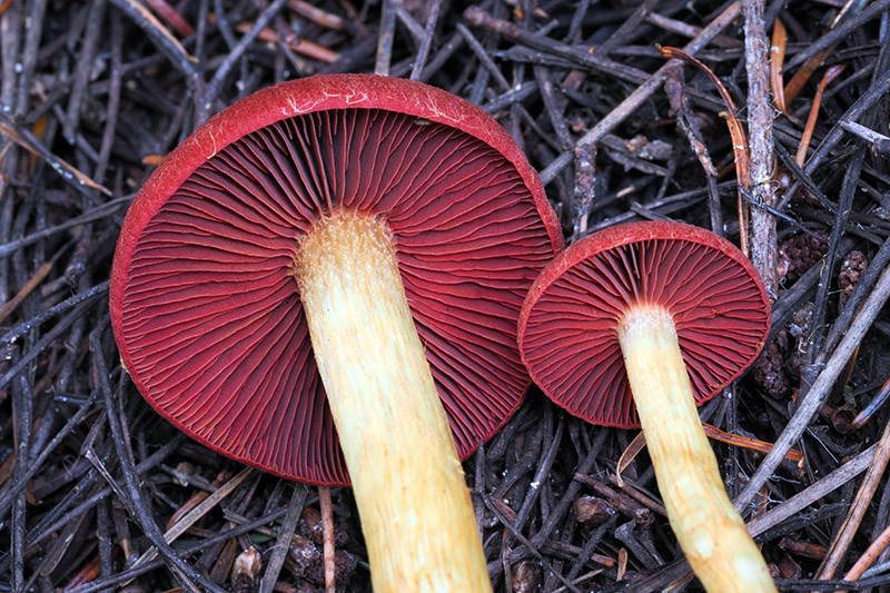 Cortinarius smithii is easily recognized by its blood-red cap and gills, yellow stipe, and preference for conifers. It is highly esteemed for producing deep red and burgundy pigments for dyeing textiles. Cortinarius semisanguineus shares the yellow stipe and red gills but has a yellowish brown to olive-brown cap. Cortinarius californicus, C. sierraensis, and C. neosanguineus differ in orange to reddish orange or red stipes.