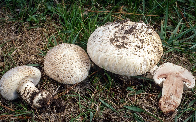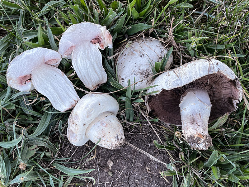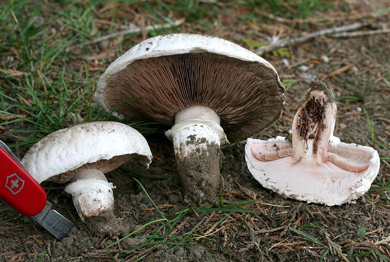 Agaricus bernardii is a short, stocky, white mushroom that resembles Agaricus bitorquis, even possessing a sheathing veil and a propensity for partial emergence. However, it can easily be told apart by the reddish-brown staining of cap and stipe tissue as well as its briny odor. Along the coast, particularly in sandy soils, Agaricus bernardii is considerably more common than A. bitorquis.