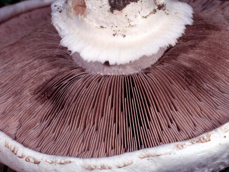 Gills free, close, pinkish-tan becoming chocolate brown, finally blackish brown.
