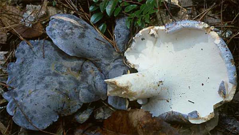 Albatrellus flettii can be recognized by the nearly smooth, bluish gray cap, tiny white pores, and central to lateral white stipe. Even rarer is Neoalbatrellus subcaeruleoporus, which forms smaller blue caps, blue pores, and a central blue stipe that turns rusty brown in age. It is known in California from only a few specimens from Humboldt and Mendocino counties. Boletopsis grisea is similar but grayish to black with only a hint of blue, has a bitter taste, and its spores are angular-nodulose, inamyloid, and pale brown in deposit.
