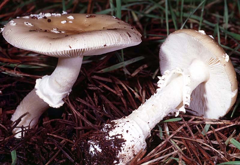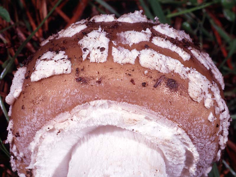 Amanita pantherina is an extremely variable species in the S.F. Bay area with cap color varying from yellowish-buff to dark brown. Most collections fall in the former category. Amanita gemmata is similar but with a yellower cap. There is speculation (but probably not true) that the two species hybridize locally causing the variation that is seen.