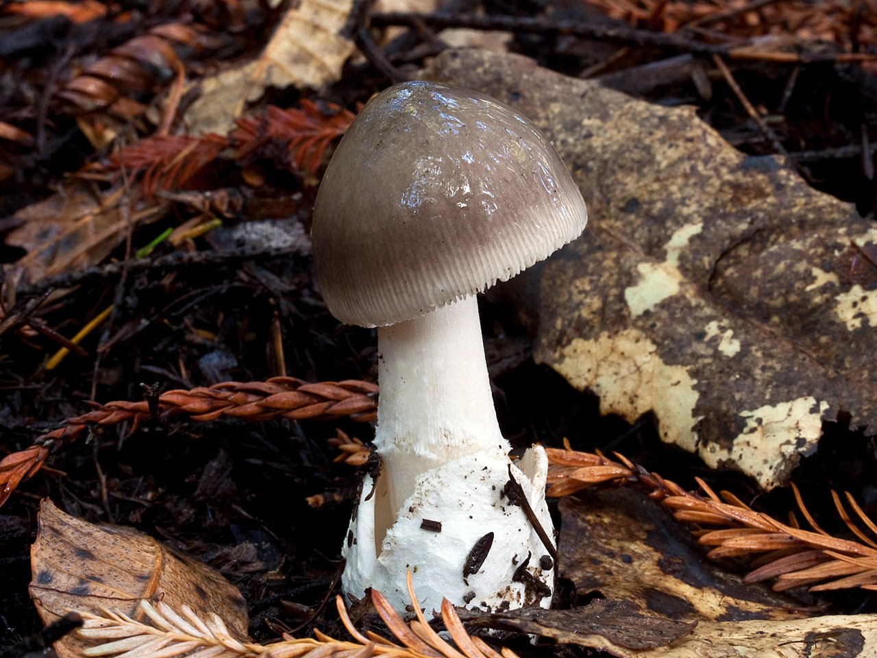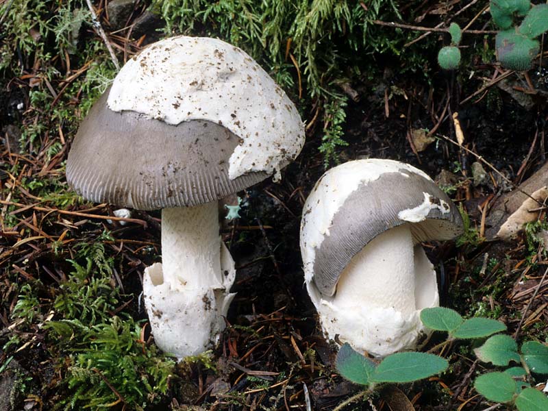 Amanita vaginata is part of a complex of grey to brown-capped Amanitas that are found in the coastal forests of California. Besides Amanita vaginata, the group includes Amanita constricta, Amanita pachycolea, and Amanita protecta. All have striate caps, lack a partial veil/annulus, and have inamyloid spores. Smallest of the group is Amanita vaginata which is characterized by a greyish cap, evanescent, white, universal veil cap patches that discolor pale ochre, and a volva that flares gradually from the stipe. Amanita constricta differs slightly in cap color, more brown to grey-brown, with universal veil cap patches that typically discolor rust-brown; more significantly, the volva of Amanita constricta, as the species name suggests, is appressed tightly to the stipe, with only the margin flaring. Amanita pachycolea is a large, robust species with a conspicuously striate, brown cap. An important fieldmark is a universal veil which is thicker than either of the above species, flaring from the base, and discoloring rust-brown. Finally Amanita protecta, differs from all of the above in having a cottony-membranous, sheathing, not flaring universal veil that at maturity crumbles leaving scaly patches on the lower portion of the stipe and often a short collar-like volva at the base. Although Amanita is known for its toxic, sometimes lethal species, members of the A. vaginata complex in California (except for A. protecta for which there is little record) are thought to be edible. None, however, are generally considered "choice," and thus are seldom eaten. As is always the case with Amanita species, only the most experienced collectors should consider them for the table.