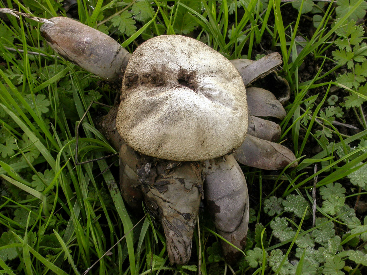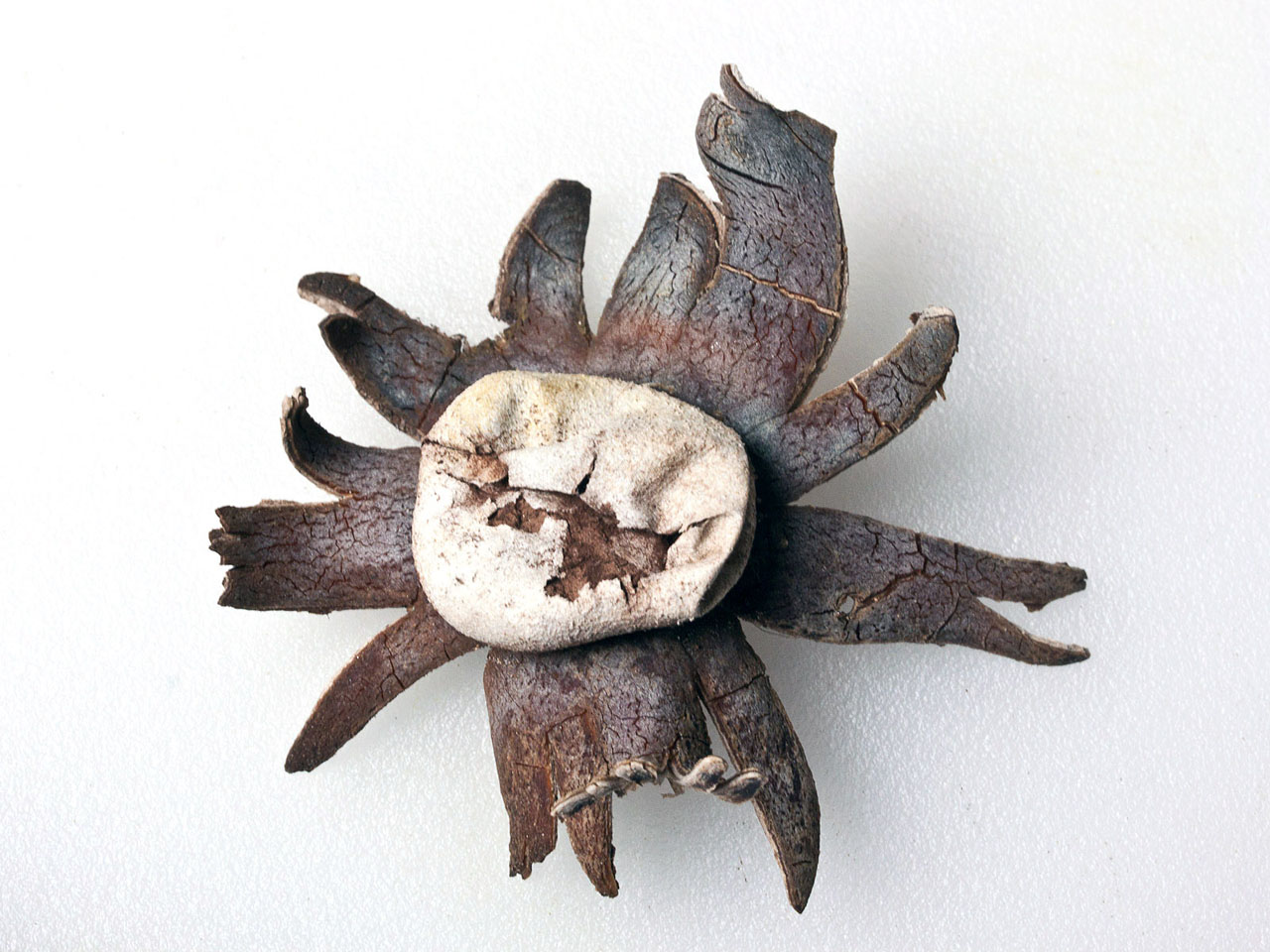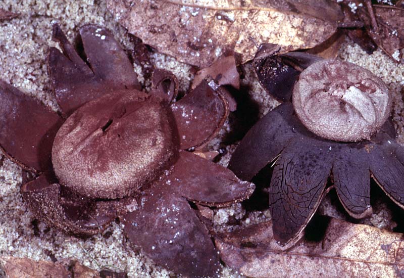 Fruiting body round to slightly compressed, 2-4 cm broad, partially emergent, becoming epigeous; exoperidium splitting into 7-14 rays with an expanded diameter of 4.5-9 cm; rays thick, leathery, the inner surface cracked, grey to brown, hygroscopic, flattened to the substrate in moist weather, encircling the spore sac when dry; spore sac globose to somewhat flattened, 1.5-3.0 cm broad, sessile, buff-brown, light-grey to medium-brown, the surface roughened or hairy, rupturing via an irregular slit or tear; gleba at first white, brown at maturity, columella absent.