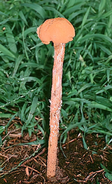 Fruiting body 4-7 cm broad, 2-3 cm thick, compressed-globose, white to cream, partially buried in the substrate; exoperidium, ruptured by spore sac and elongating stalk; spore sac 2.5-4.5 cm broad, 2-3 cm thick, convex, covered by a white membranous endoperidium, the latter splitting horizontally along the margin, exposing a sticky, brown spore mass; stalk 15-35 cm tall, 0.5-1.5 cm thick, equal to tapered at the base, dry, with fibrous, rusty-brown scales; a membranous volva at the base shrivels in age.
