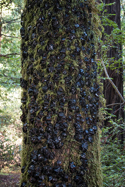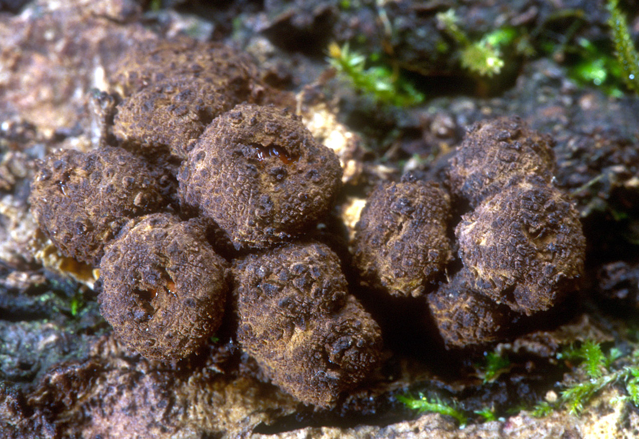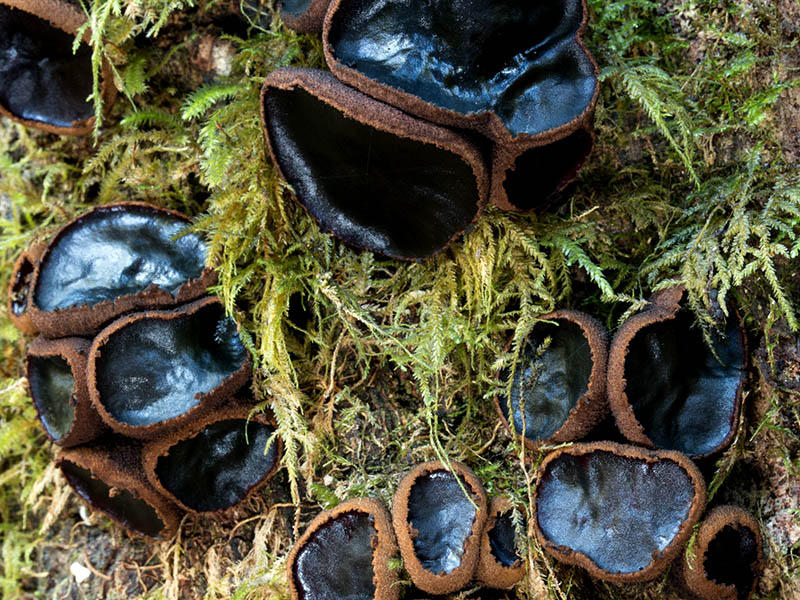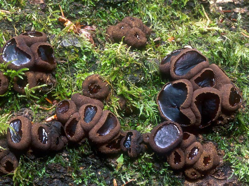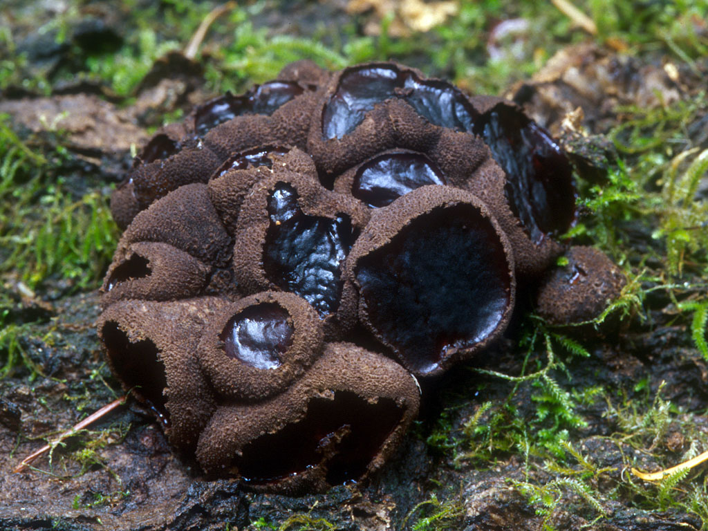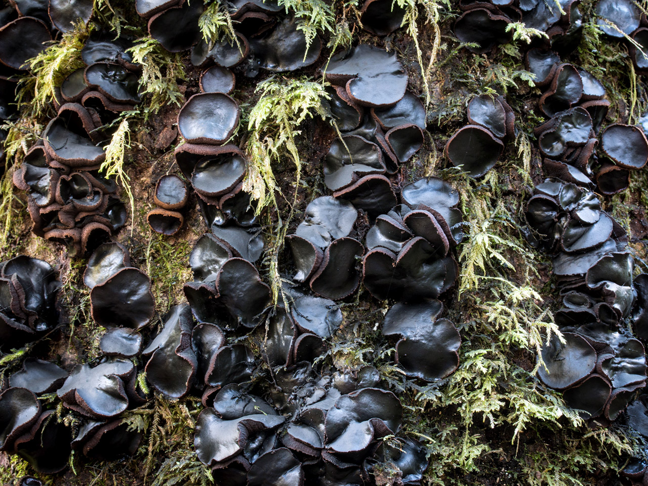 Commonly known as Black Jelly drops, the gelatinous, top-shaped fruiting bodies of Bulgaria inquinans are often found in large groups on downed logs of coast live oak (Quercus agrifolia) and tanbark oak (Notholithocarpus densiflorus). It is most easily recognized after periods of rain, when the shallow black cups have a glossy sheen, in sharp contrast to the scurfy, brown exterior. Only Urnula padeniana and Psuedosarcosoma latahense are similar. These Ascomycete cousins are also black, rubbery, and cupulate, but differ in having a wrinkled, not scurfy exterior. Additionally, they fruit singly or in small numbers on small branches, never in large groups on logs. Unrelated to Bulgaria inquinans is the Basidiomycete jelly fungus Exidia glandulosa. It mimics Bulgaria inquinans with black, gelatinous fruitings on rotting hardwoods, but these are cerebriform, not cupulate.