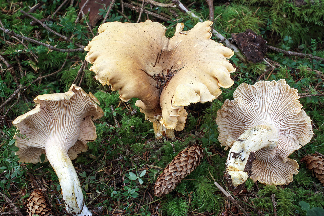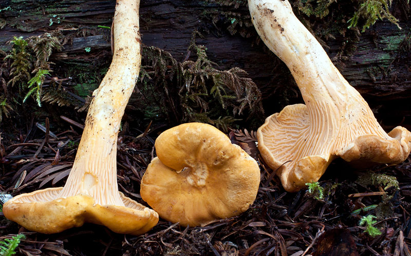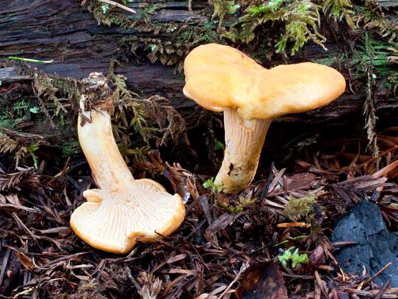 Cantharellus formosus is a medium-sized chanterelle that is distinguished by a yellowish orange to salmon-colored cap that develops grayish brown tones in age, decurrent gill folds that are often tinged pink, a slender stipe, pleasant fruity odor, and habit with conifers, especially Sitka spruce and Douglas fir along our northern coast. It is the most important commercially collected chanterelle in the Pacific Northwest.