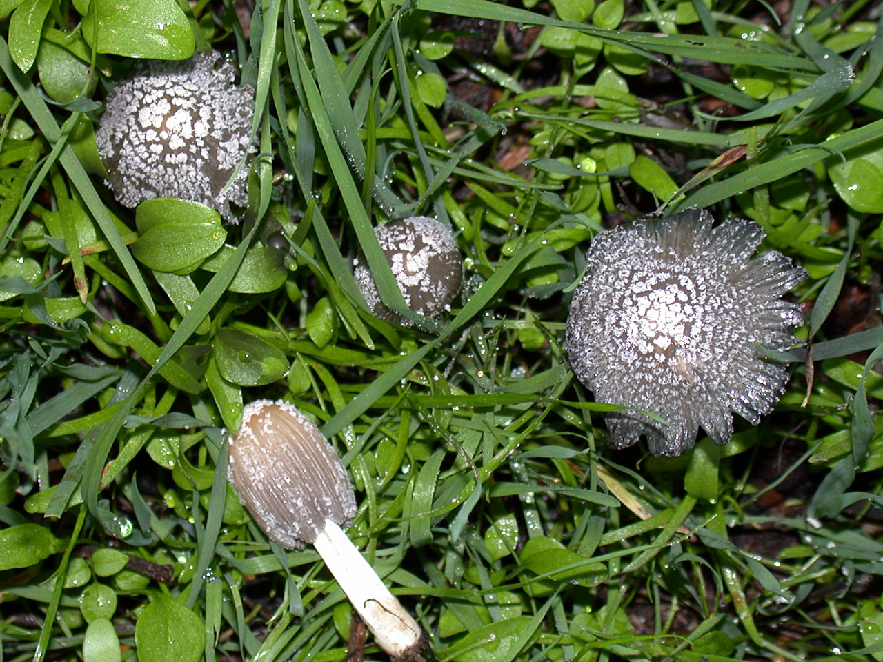 Gills free, crowded, relatively broad, up to 6.0 mm, obtuse at the margin; edges and faces minutely hairy (use hand lens), cream-colored, then greyish, finally blackish from maturing spores; lamellulae three to four-seried.