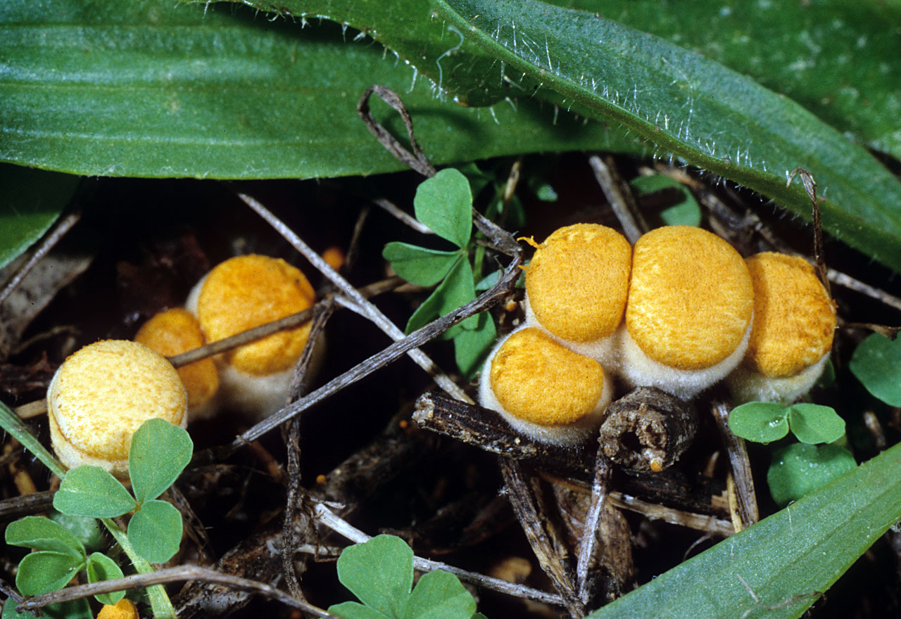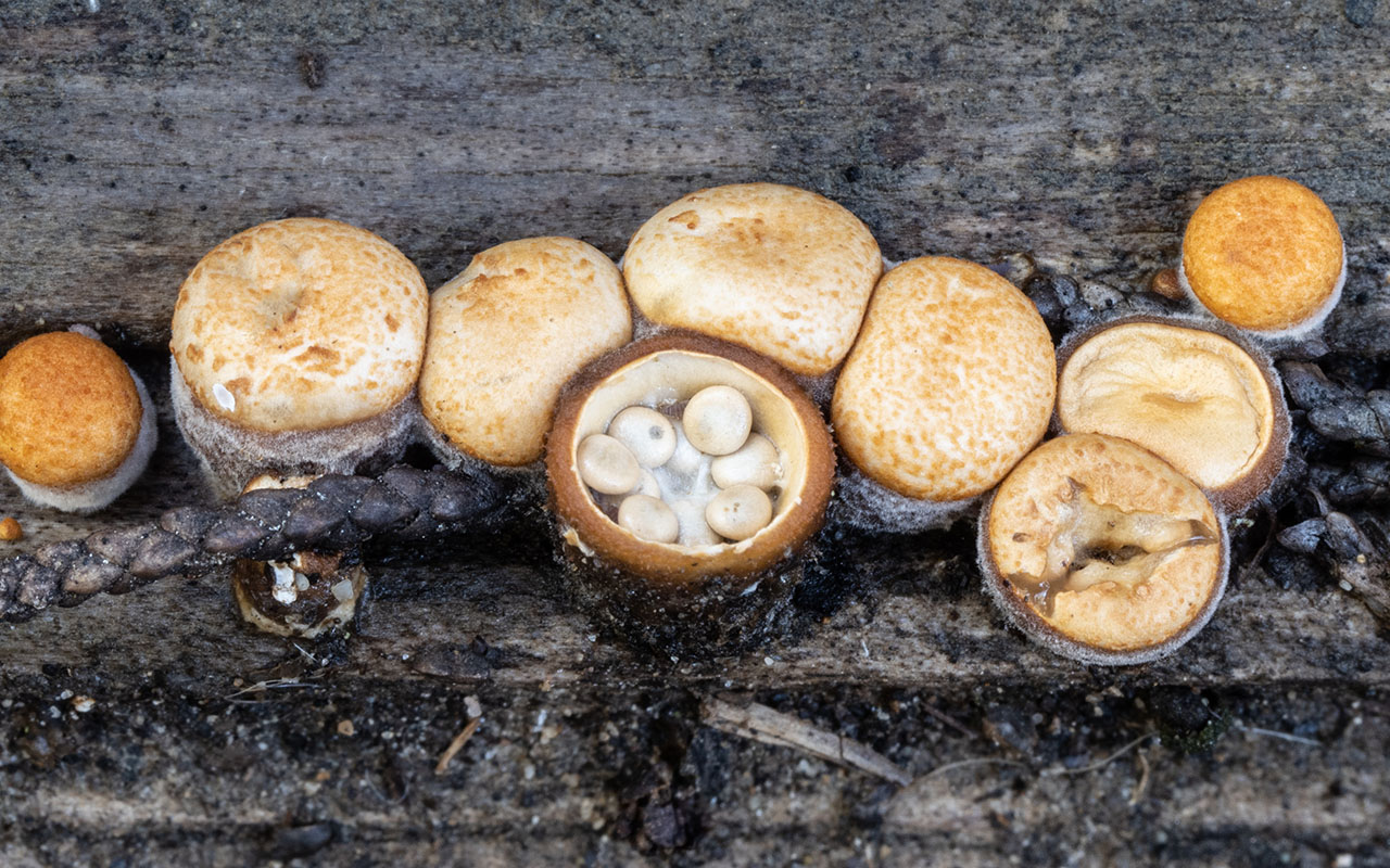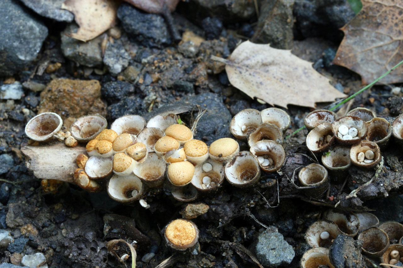 Bird's nest fungi are represented by about six or seven species in the San Francsico Bay Area with Crucibuum laevae being one of the most likely to be encountered. It is distinguished by a buff-brown, thin-walled, flaring cup with a smooth interior, and pallid to white eggs that are connected to the cup via a thin cord. Related local bird's nests include species of Cyathus and Nidula, all of which have thicker-walled cups. In addition, the cups and peridioles of Cyathus species are darker (grey-brown to dark-grey), while Nidula species have peridioles which are embedded in a gelatinous matrix.