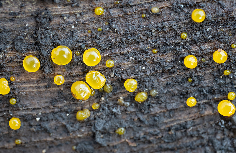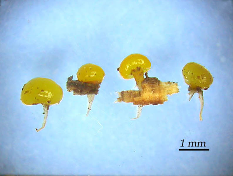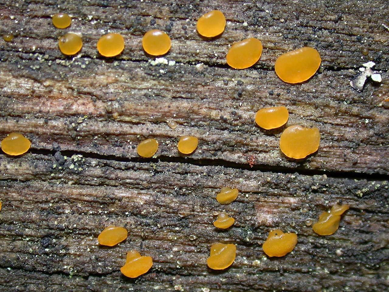 Fruiting body 0.5-1.5 (2) mm broad, compressed-globose to cushion-shaped, rounded in outline except when deformed from mutual pressure; sessile to substipitate, if the latter, then peg-shaped to turbinate in profile, anchored by thin, translucent-white, root-like projections; surface convex, occasionally with shallow folds, glabrous to minutely pruinose, yellow-orange, becoming yellowish-brown, drying dingy orange-brown; context gelatinous, yellowish, reviving after drying; odor and taste not distinctive.