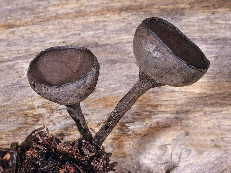Fruiting body a stipitate cup, 0.5-2.0 cm broad, shallowly to deeply concave; margin incurved to upturned; hymenium dark-brown to black, glabrous; exterior of cup blackish, smooth, becoming wrinkled with age or drying, covered with matted, dark-grey hairs; odor and taste not determined.