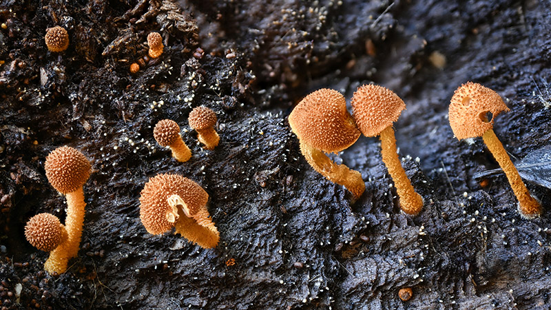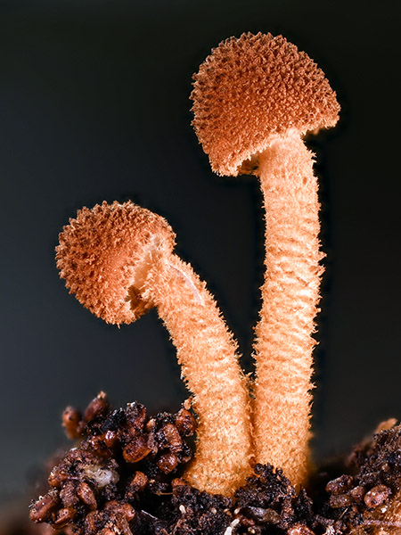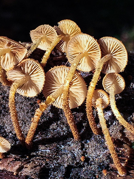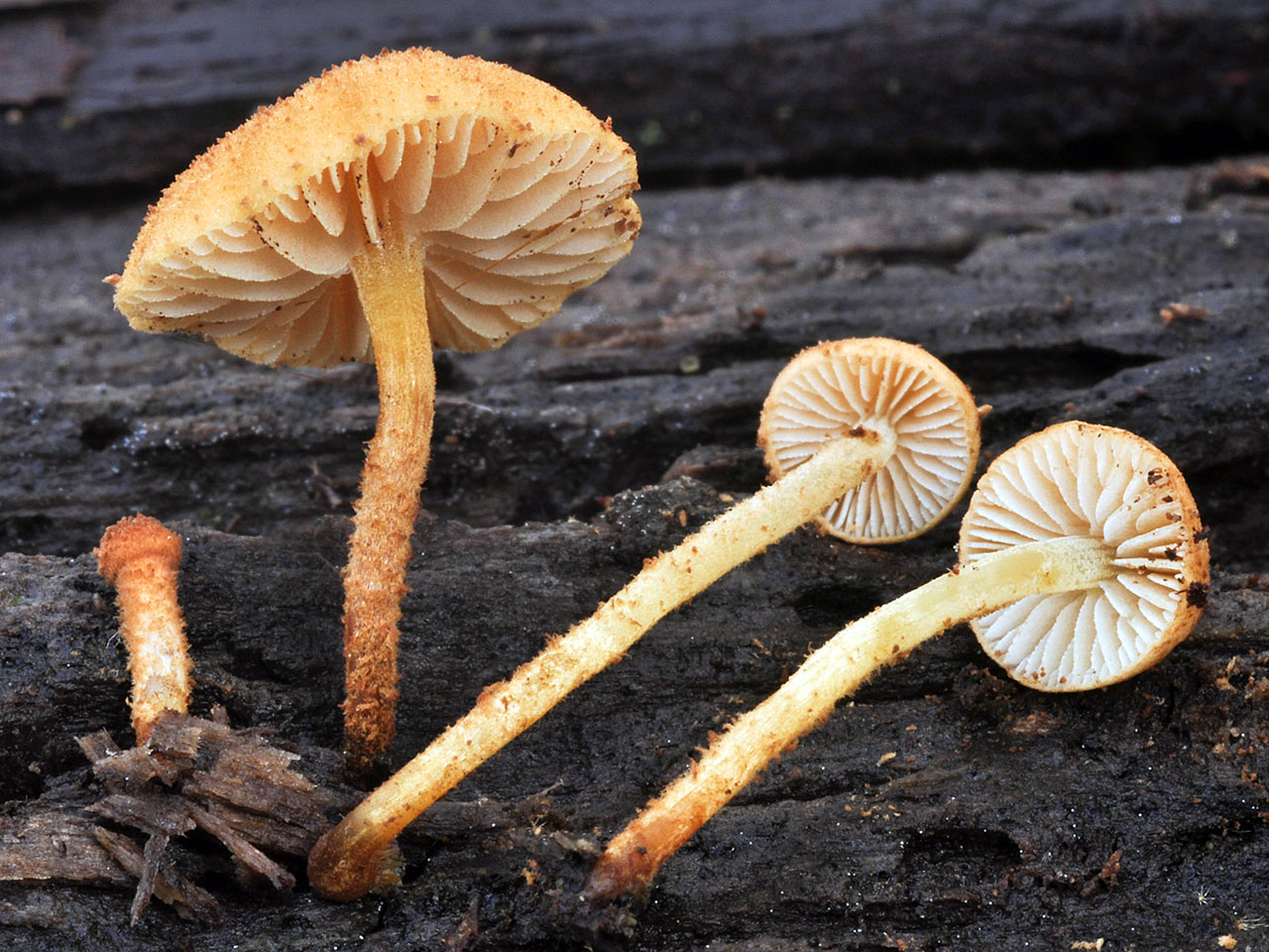 The reddish-ochraceous-brown coloration, finely floccose stipe and cap, and habitat on rotting wood is distinctive. Phaeomarasmius erinaceus has a dark reddish brown spiky tufted tomentose cap and stipe, growing on oak and tanoak.