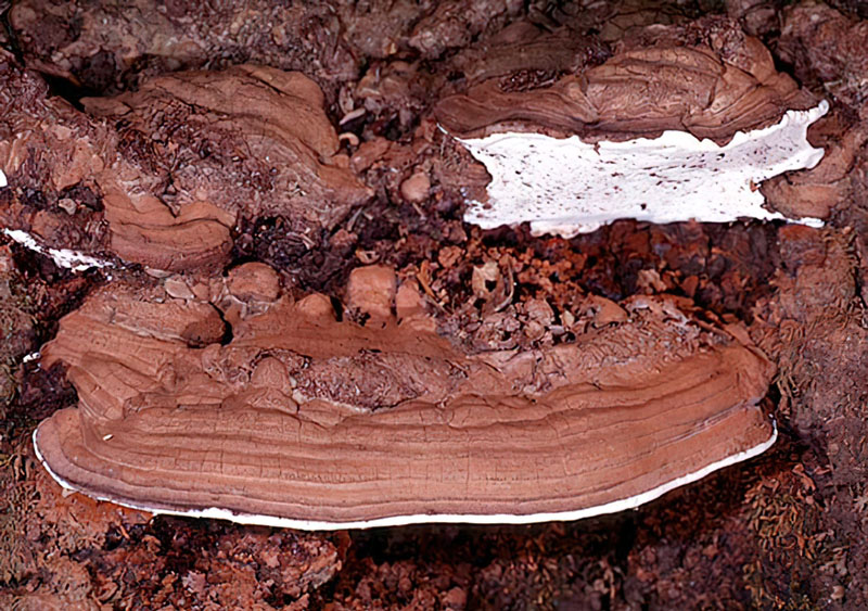 Our best known shelf fungus, Ganoderma applanatum is distinguished from other woody polypores by a dull grey-brown, bumpy, usually zonate cap, often powdered brown from released spores, and a white pore surface which instantly darkens when injured. The latter feature makes it a favorite of artists which use the smooth white surface as a canvas. Like a number of perennial woody conks, the age of a fruiting body can be roughly determined by sectioning and counting the tube layers. Related fungi include Ganoderma tsugae, uncommon in our area, with a shiny red/brown to mahogany brown cap and pores that do not bruise and Fomitopsis pinicola with a reddish-brown cap margin and pores that bruise slowly pale yellowish-buff. One other Ganoderma that occurs in California is Ganoderma brownii. According to Gilbertson & Ryvarden, it is similar to Ganoderma applanatum but differs in having larger spores and a yellow pore surface.