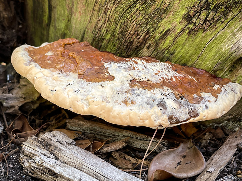 The reddish shiny top and growth on hardwoods is distintive. Ganoderma polychromum is often confused with Ganoderma lucidum. "For the past century, many studies of Ganoderma in North America and other regions of the world have used the name G. lucidum sensu lato for any laccate (shiny or varnished) Ganoderma species growing on hardwood trees or substrates."