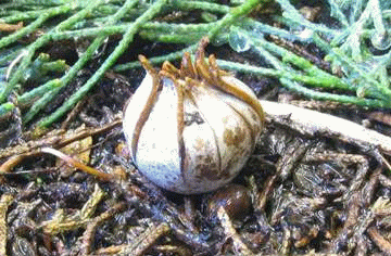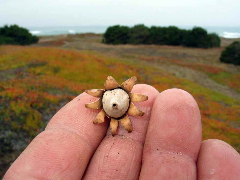 An important fieldmark of Geastrum floriforme is its hygroscopic habit, i.e. the ability of the rays to expand and close around the spore sac with changing humidity. This contrasts with most Geastrums, which at maturity do not respond to changes in humidity and are "fixed." Geastrum floriforme may be more common than records indicate. Although rarely collected it is probably overlooked because of its diminutive size and appearance which when dry resembles a small seed pod. Other hygroscopic Geastrums that may occur in California include Geastrum corollinum which differs in possessing a well defined peristome and smaller spores; Geastrum arenarium which is only partially hygroscopic with a spore sac that sits on a short pedicel, and Geastrum kotlabae, which has a plicate peristome.