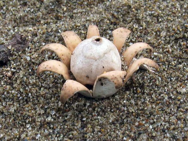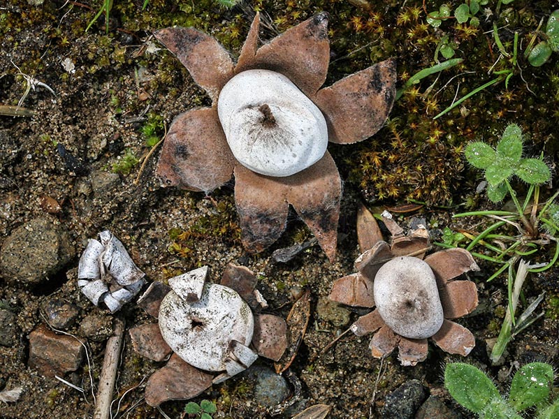 Fruiting body subglobose, 10-20 mm broad before splitting, outer mycelial layer initially binding debris, soon lost, thus appearing debris free; expanded fruiting body 1.5-3.5 (4.0) cm broad; exoperidium splitting to form 5-10 rays, upper surface of rays various shades of brown, more or less glabrous, strongly hygroscopic, i.e. curled over the spore sac in dry weather, lying flat to slightly revolute when moist; endoperidial body or spore sac sessile, 6-15 mm, the surface grey-brown in youth, furfuraceous, fading to nearly white in senescent specimens; peristome indistinct i.e. usually the same color as the spore sac, the opening slightly elevated with a fibrillose margin.