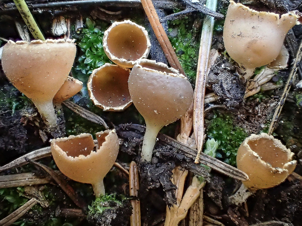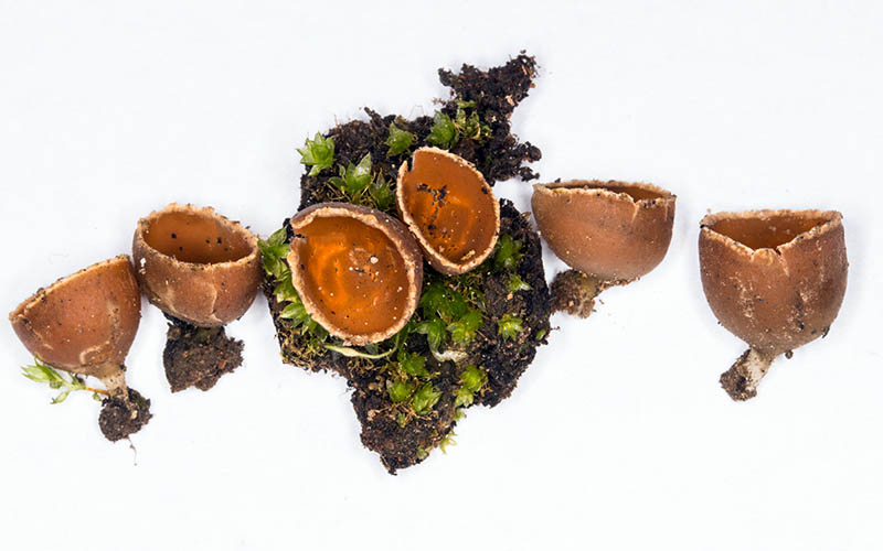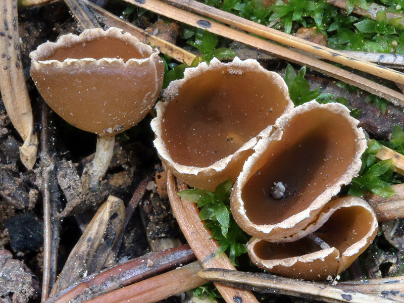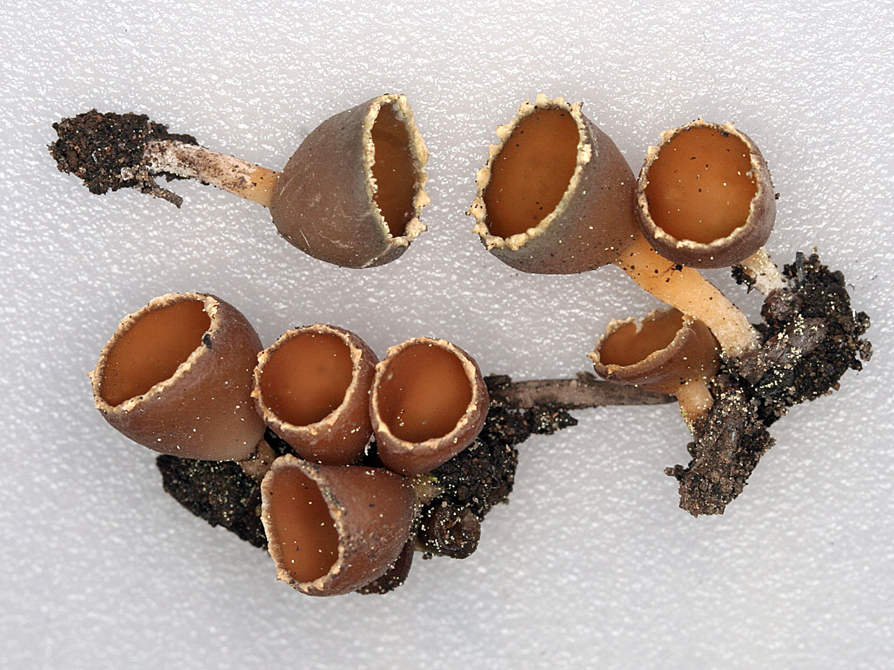 Fruiting body urn to goblet shaped; apothecia 0.5-1.5 cm broad, deeply cupulate, not expanding; margin pallid, crenate, incurved to upturned; fertile surface dull orange-brown to reddish-brown, glabrous; external surface glabrous, dull-brown, fading to pale-buff; stipe 0.3-1.0 cm long, 1.0-2.0 mm thick, straight to curved, the surface dull-brown covered with a white tomentum.