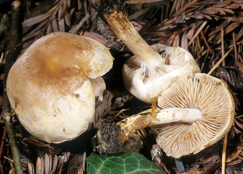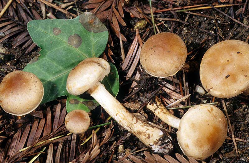 This drab brown mushroom is recognized by a bicolored cap, brown to reddish-brown at the disc, shading to cream or buff at the margin. Scattered veil fibrils are typically seen on the stipe sometimes forming an ephemeral ring. Additional although not definitive field characters include a radish-like odor and conifer habit. The radish odor, common to many Hebeloma species, helps to distinguish it from Inocybes which have similar colored spores, but different odors. Inocybe species also typically have conspicuously fibrillose, dry caps. Some Cortinarius species are also similar, but they have rusty, not dull brown spores and usually a well-developed fibrillose partial veil. It should be noted that there is considerable uncertainty regarding the species concept of Hebeloma mesophaeum. Smith et.al in The Veiled Species of Hebeloma regard it as a “collective species” listing 11 varieties differing subtly. The above description covers what is commonly seen under pines in the San Francisco Bay Area.