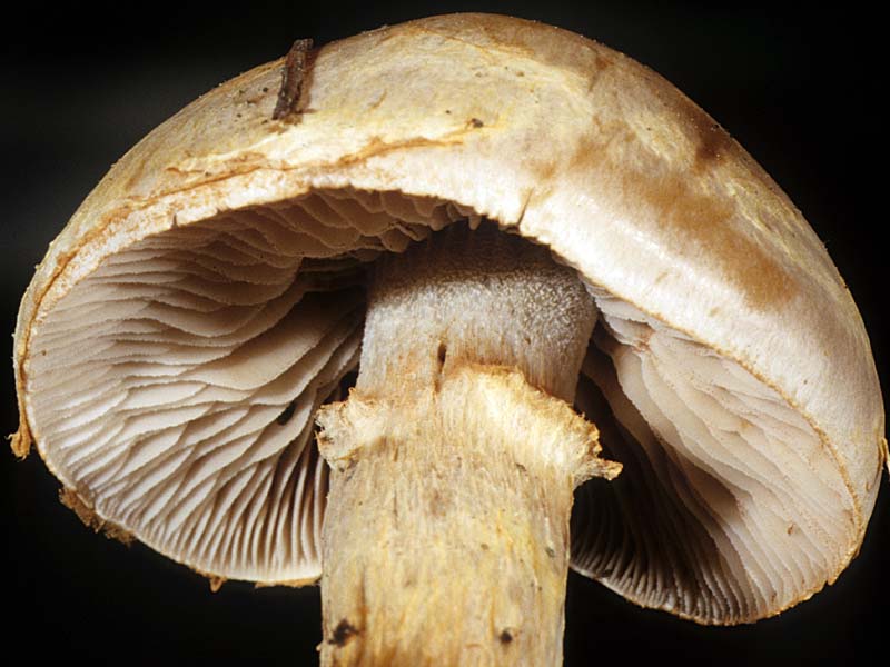 Gills adnexed to notched, close, relatively broad, up to 8 mm in width, cream colored when young, maturing dull brown, edges finely crenate to minutely fringed (use hand lens); lamellulae in 3-4 series.