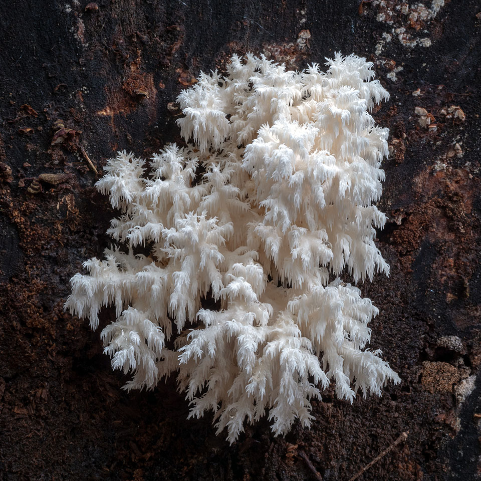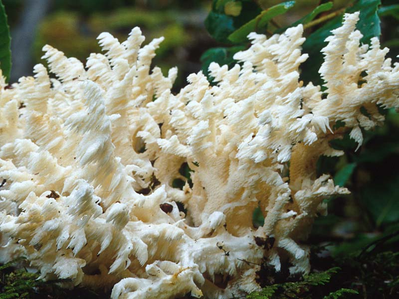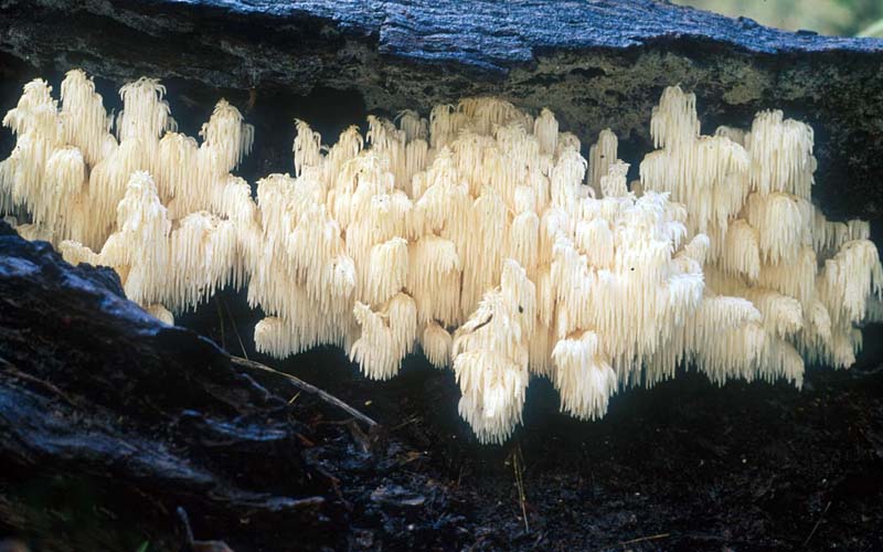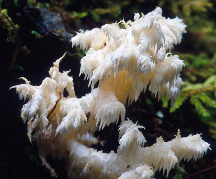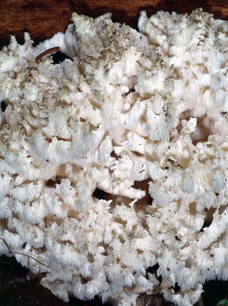 Hericium coralloides is the most delicate of the three species that occur in our area. It has a loose, open branched structure, and relatively short spines which are arranged in rows except for the branch tips where they are tufted. Hericium erinaceus, more common than H. coralloides, also grows on hardwood logs, can be distinguished by an unbranched cushion-shaped base from which hang long, slender, white to cream-colored teeth. Hericum abietus has a fruiting body intermediate in structure between H. coralloides and H. erincaceus. It grows on conifer logs, sometimes forming impressive, large, white to cream-colored fruitings.