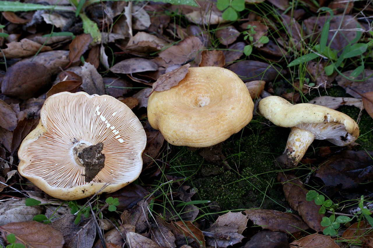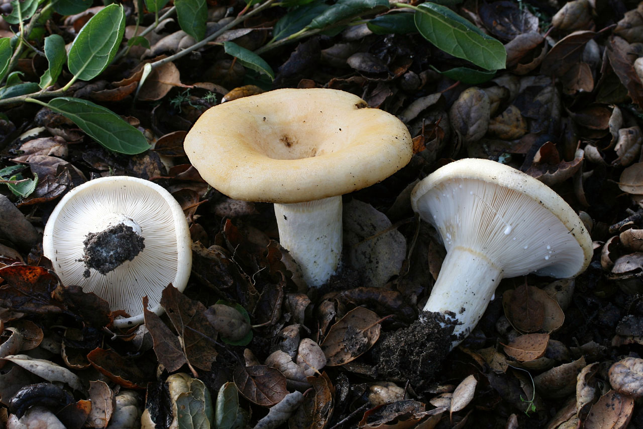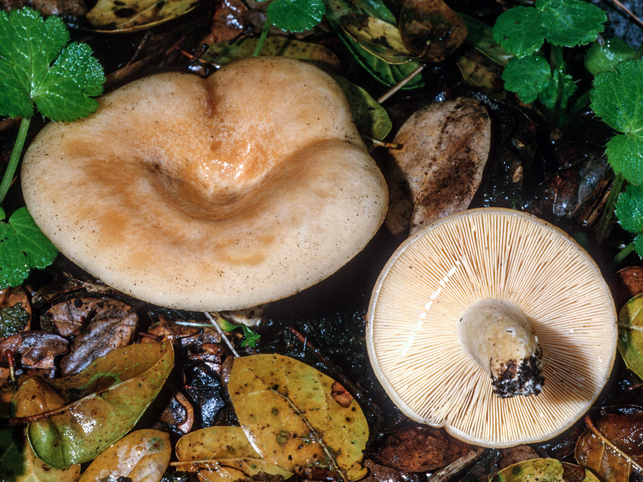 Lactarius alnicola is distinguished by a viscid, vanilla-colored, slightly zonate cap, white, usually unchanging latex and a yellow-brown spotted stipe. It is rather common in our area under Quercus agrifolia (coast live oak) where inexperienced collectors sometimes mistake if for the yellow chanterelle, Cantharellus cibarius. It is a mistake made only once as the taste is unforgettably peppery. Ironically, despite its species name, Lactarius alnicola is not common under alder.