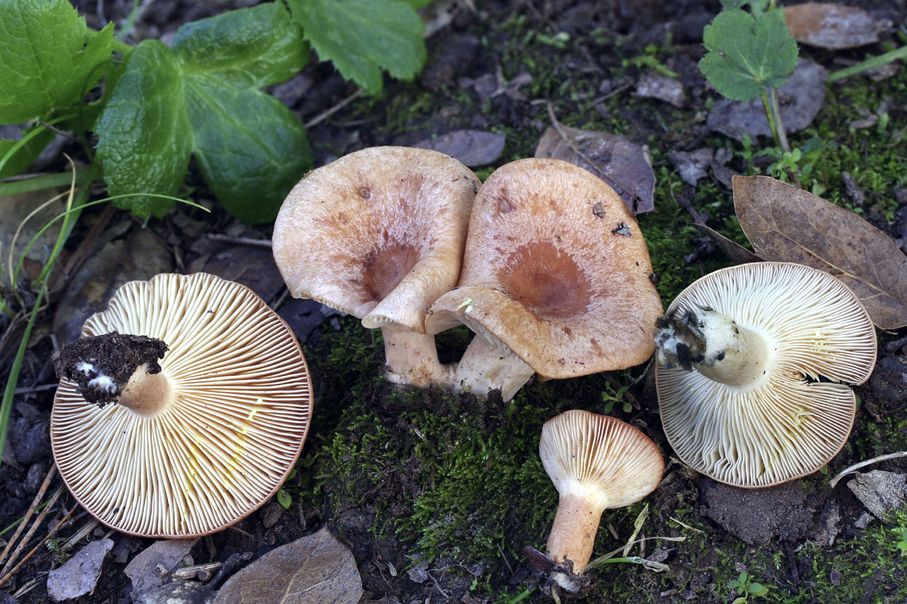 Gills adnate to subdecurrent, moderately broad, close, brittle, at first pale peach-buff, then orange-buff, bleeding a white, soon yellow latex.