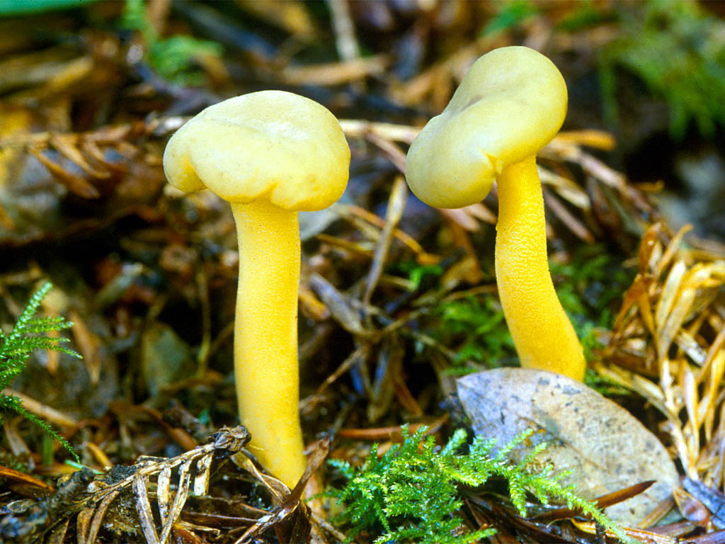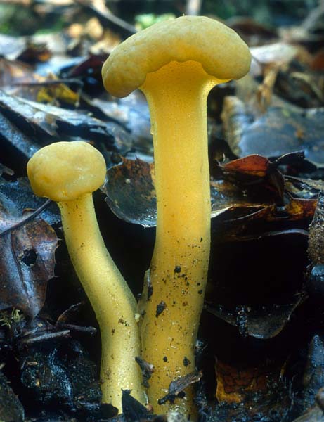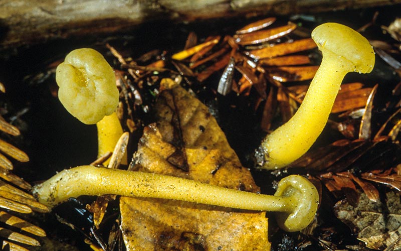 At first glance this diminutive yellowish mushroom looks like it could be a gilled Basidiomycete, but an examination of the fertile layer, which is on the upper, not lower surface, reveals asci and ascospores. The common name "Jelly Bellies," refers of course to the gelatinous nature of this fungus. Beside texture, Leotia lubrica is characterized by a yellowish, viscid (when moist) cap with an inrolled margin. The stipe is concolorous with the cap but usually brighter, and is finely scaled. Closely related is Leotia viscosa, which has an olive to dark-green cap and a yellowish to buff-colored stipe.