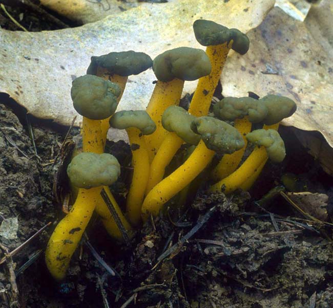 Leotia viscosa is characterized by a greenish, viscid cap with a pallid undersurface and a pale yellowish stipe dotted with green granules, especially near the apex. More common in California but very similar is Leotia lubrica. It is distinguished by a yellowish rather than green cap.
