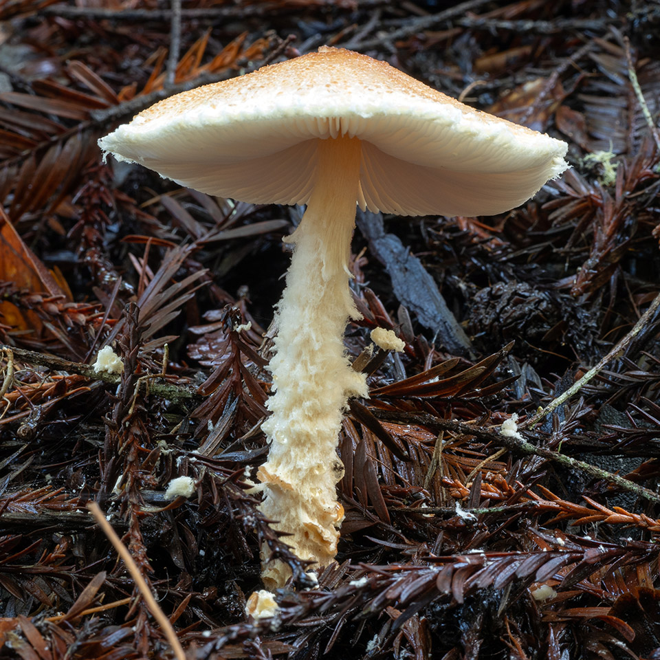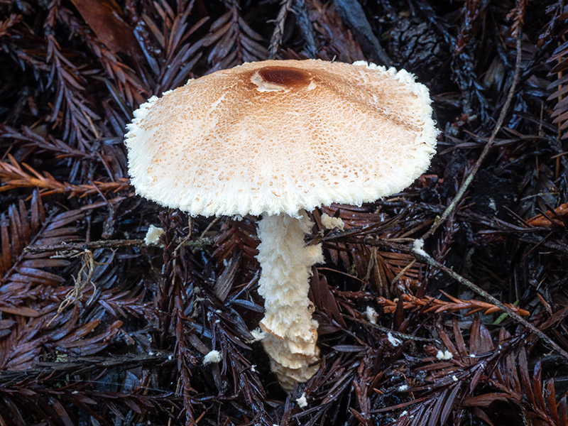 Lepiota magnispora is a beautiful woodland species easily recognized by its coarsely scaled, yellowish-brown cap, appendiculate margin, shaggy stipe, free gills and white spore print. Unlike many Lepiotas, the partial veil does not form a well developed annulus.