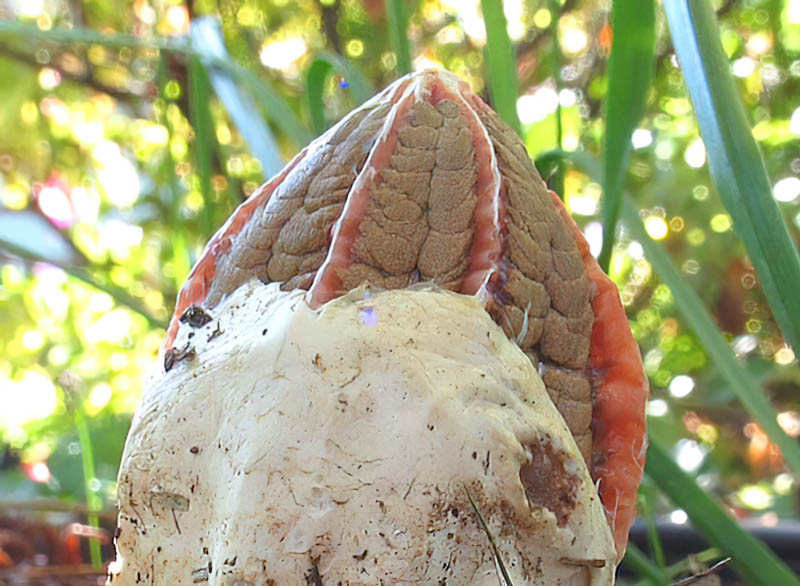 Fruiting body arising from a subhypogeous egg, the latter often in groups with conspicuous rhizomorphs; mature fruiting body 4.0-12.0 cm tall, consisting of a pseudostipe sheathed at the base by a white, membranous volva and a fertile head; pseudostipe, 2.0-9.0 cm long, 1.0-1.5 cm thick, four to five ribbed, pallid to flesh-colored, fragile, hollow, the surface wrinkled to lacunose; fertile head up to 3.0 cm long, conic to obtuse-conic, composed of four to five clasped arms, contoured like the pseudostipe, i.e. with alternating ribs and furrows; in youth the furrows covered with ochre-brown to dark-olive gleba, the ridges reddish-orange; in age the spore-bearing surface entirely reddish-orange; odor fetid at maturity; taste not investigated.