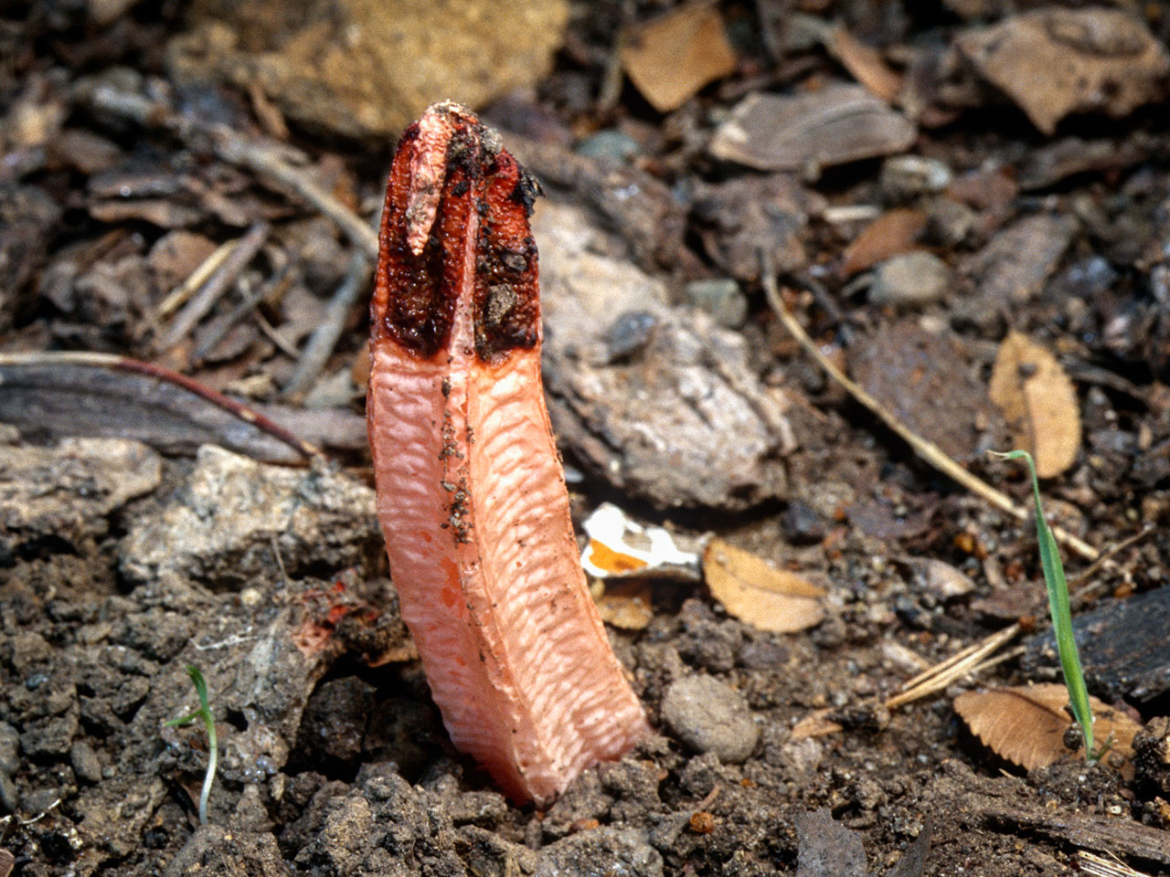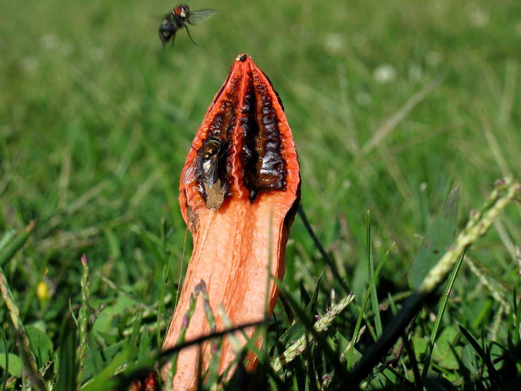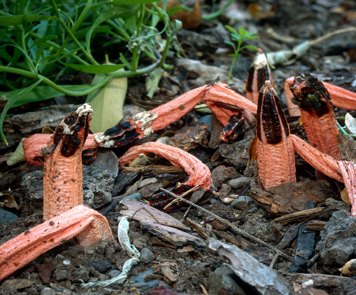 Lysurus mokusin combines a fetid odor with a fruiting body that imitates rotting flesh. The deception is irresistible to flies which carry off the olive gleba-bearing spores, helping disperse the species. Its distribution is nonetheless limited, found only in parks and gardens etc. Like other California stinkhorns, with perhaps the exception of Phallus hadriani, Lysurus mokusin is though to be an introduced species, arriving on nursery stock from tropical regions. It is recognized by a strongly ribbed pseudostipe and reddish "cap" composed of four to five furrowed, clasped arms. A related paler species, Lysurus cruciatus (=L. borealis), has a round, not ribbed pseudostipe, and at maturity, spreading, not clasped arms.