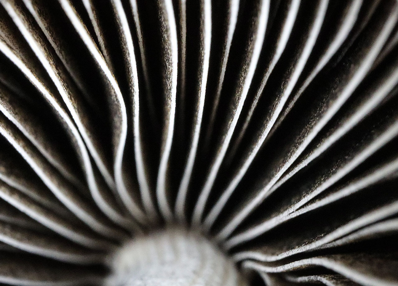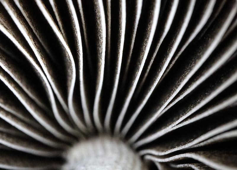 Gills ascending-adnate to adnexed, close, broad, up to 10 mm in width, dingy greyish-tan when young, the edges lighter than the faces, minutely fringed with a hand lens, becoming mottled blackish, blackish overall in age; lamellulae in two series.