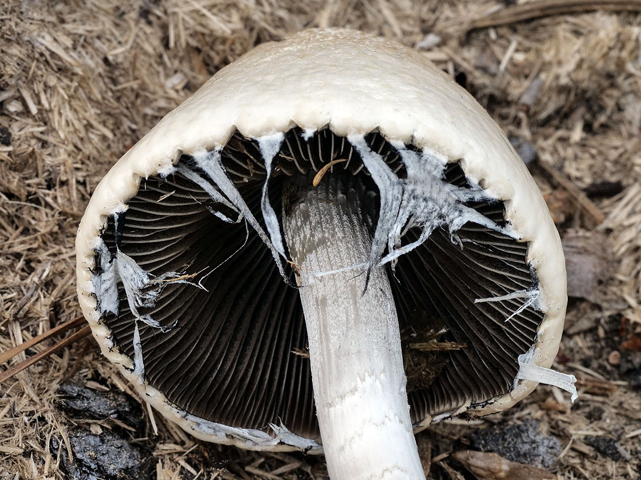 Stipe up to 15 cm long, 0.5-1.0 cm thick, slender relative to the cap, equal except enlarged at the base, the core narrow, stuffed; upper surface conspicuously pruinose-striate, cream-colored, lower portion appressed fibrillose, colored like the cap or dingy yellowish-tan, dry to lubricous when moist; stipe base when fresh, covered with a white pubescence, drying down and becoming tomentose; partial veil cottony-fibrillose, white, forming a fragile superior annulus, at maturity flattened to the stipe, blackened by spores.