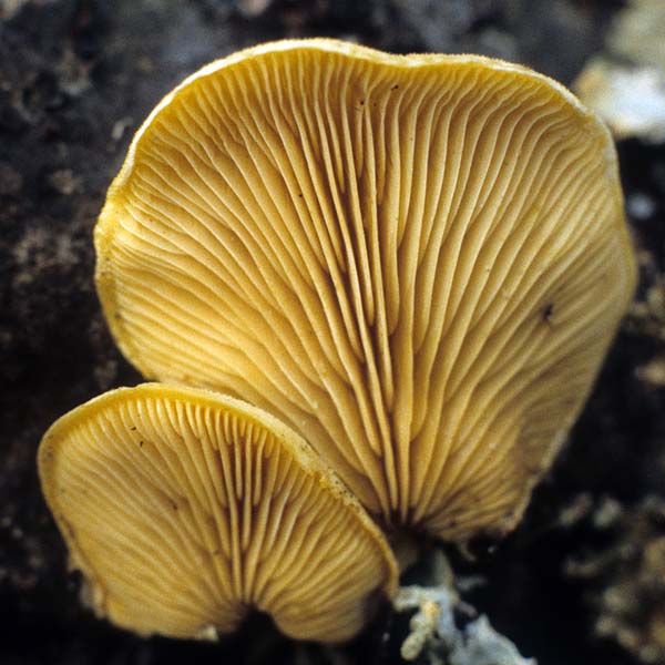 This fleshy shelf fungus looks like and was once placed in Pleurotus, but was moved into its own genus because of spore and context differences. The skunk-like odor and pale orange, tomentose cap easily distinguish it from any of our local Panus or Crepidotus species.