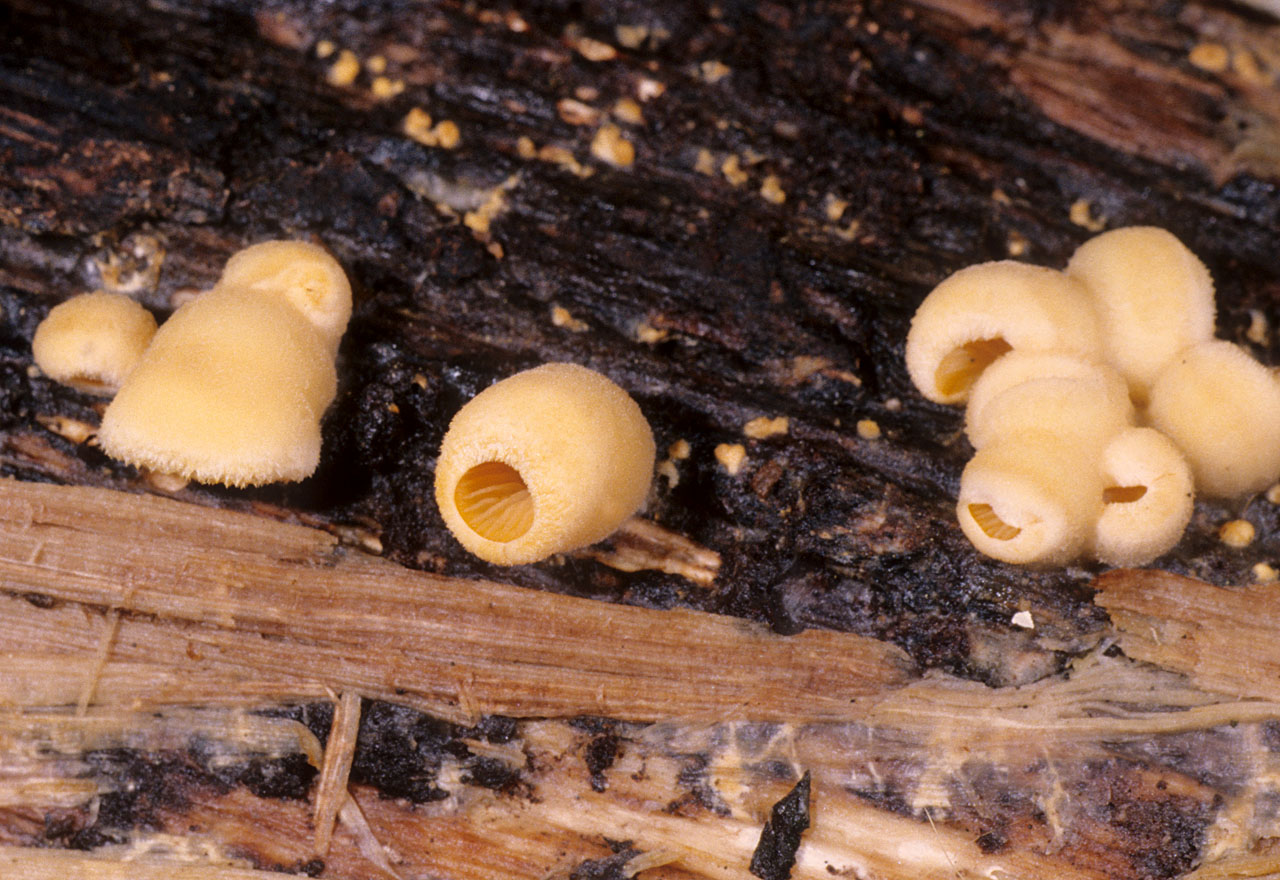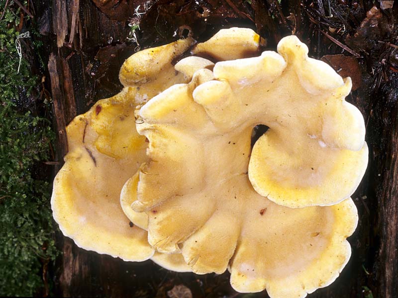 Clustered or forming overlapping shelves on log and branches of hardwoods and conifers; fruiting from mid to late winter.