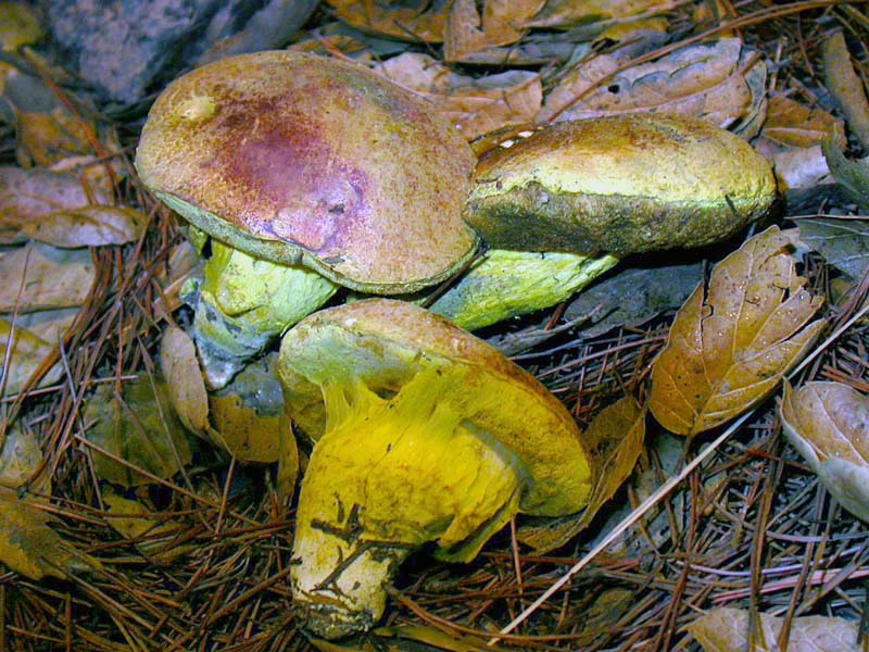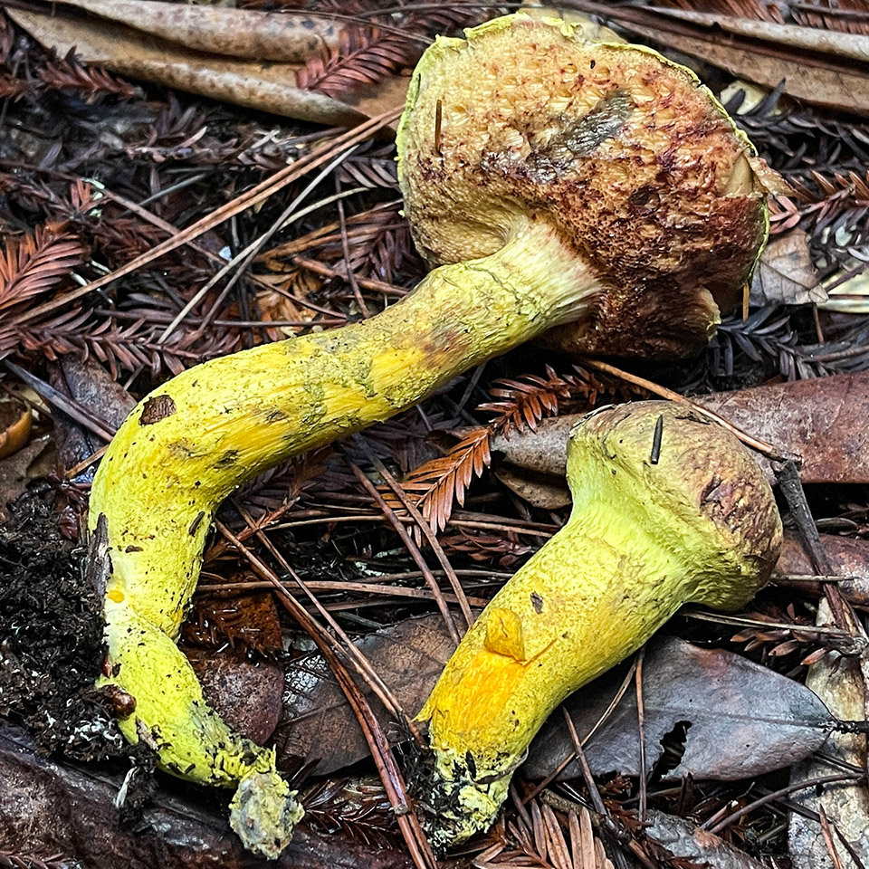 Pulverobletus ravenelii is unusual among boletes in possessing a universal veil. Even more remarkable is the florescent-yellow color of the veil which makes young specimens nearly unmistakable. With age and weathering, however, much of the veil disappears except for remnants on the stipe and cap margin. Mature specimens have a reddish-brown tinged cap which can cause confusion with Butyriboletus persolidus (Butter Bolete). The latter differs in its larger size and reticulate stipe. Boletus orovillus, a sulfur-colored bolete, is also similar but fruits before the fall rains near conifer stumps and woody debris, and does not develop reddish-brown cap tones.