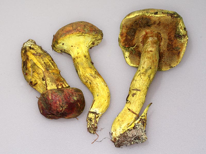 Stipe 4.0-10.0 cm long, 2.5-4.0 cm thick, solid, equal to ventricose, if the latter, then narrowed at the base; apex not reticulate, surface covered by a bright-yellow, fibrillose-tomentose universal veil, underlying surface pallid, longitudinally striate; context yellow, unchanging; pale yellowish mycelium at the base.