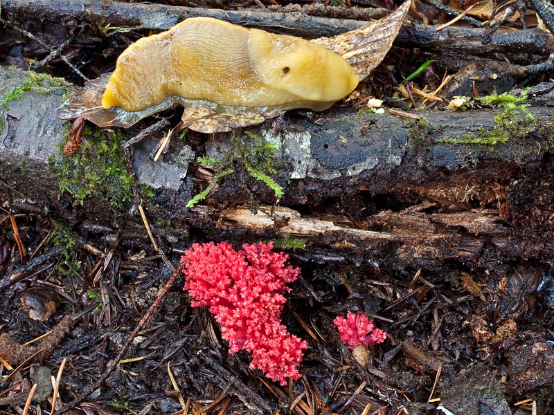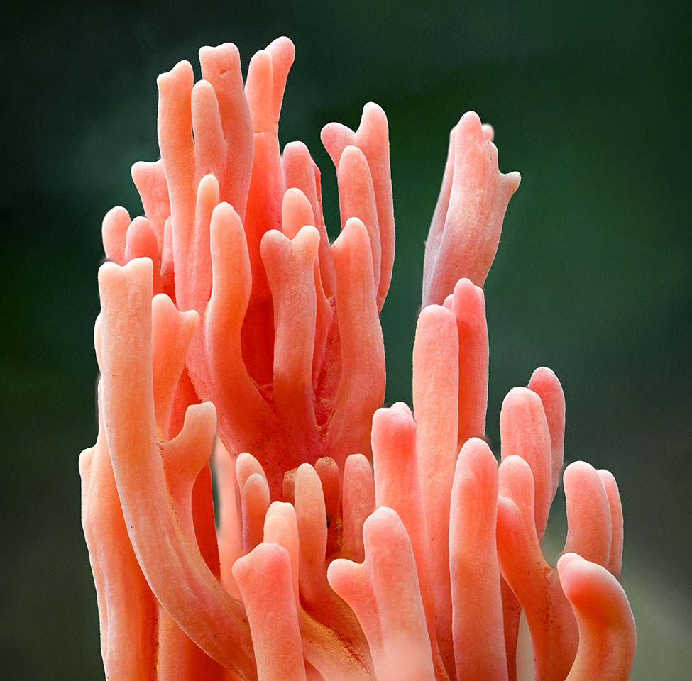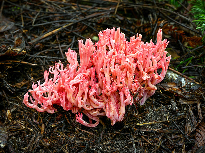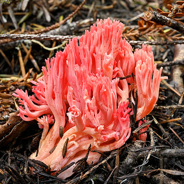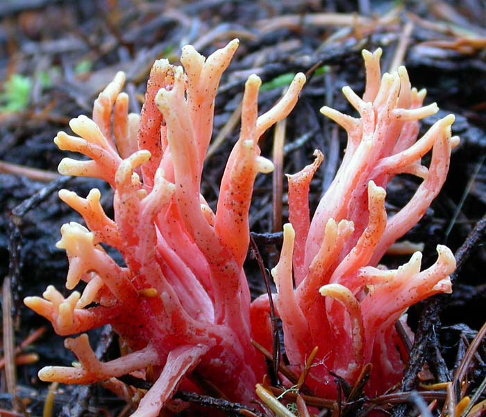 Ramaria araiospora is distinguished by its deep pinkish red to scarlet-red branches which make this is a strikingly beautiful and nearly unmistakable coral fungus. Two varieties occur: Ramaria araiospora var. araiospora with yellow to orange branch tips and R. araiospora var. rubella with red branch tips. Both are common in Mendocino Co. in mixed forests with Douglas fir (Pseudotsuga menziesii) and hemlock (Tsuga heterophylla).