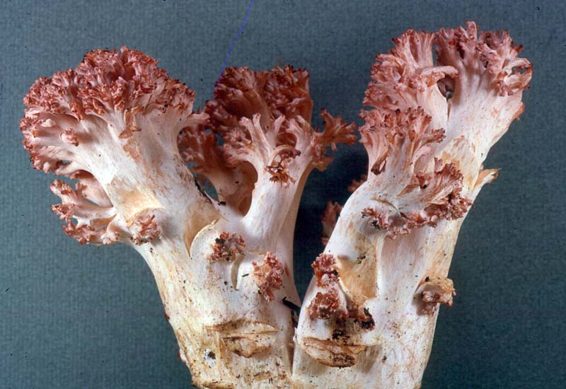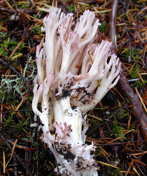 Fruiting body 8-22 cm tall, 10-25 cm broad, coralloid, intricately branched from a large fleshy base; branches spreading and elongating in age, white to creamy-white when young, yellowish white in age; branch tips vinaceous- red when young, fading in age to pallid buff, with only the immature lower branch tips showing the vinaceous tones; flesh white, brittle; odor and taste mild.
