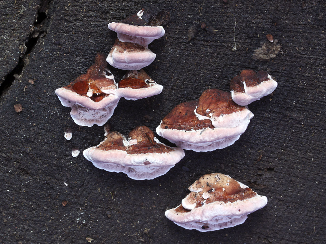 Though not the most common of our local conks, Rhodofomes cajanderi is easily the prettiest. The mahogany-brown to almost black shelves of fresh Rhodofomes cajanderi with contrasting rose-pink margins and pores are a visual delight. In age the pink color becomes muted but specimens are still easily recognized.