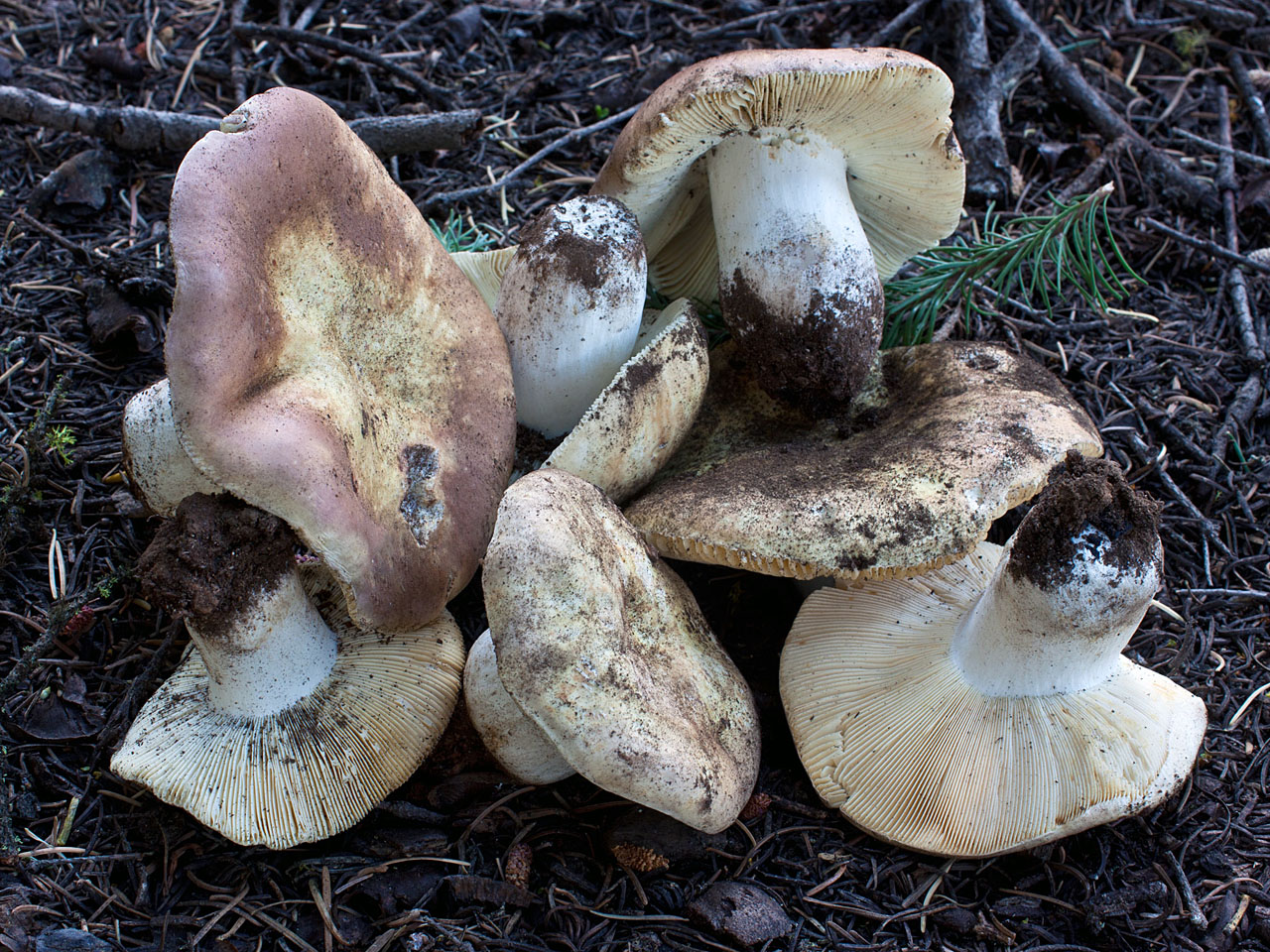 Russula mustelina is distinguished by a cream-colored cap with pink to vinaceous splotches, cream gills and spores, a mild taste, and very hard tissues, especially in the stipe. It is similar in coloration to R. basifurcata, a less robust species with gills conspicuously forked near the stipe, which grows in the fall and spring at lower elevations, usually associated with live oaks.