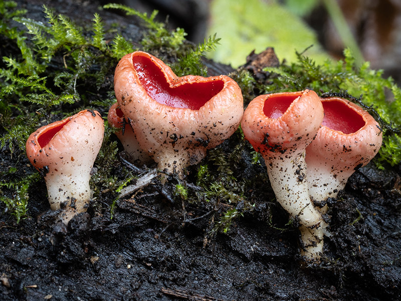 Sarcoscypha coccinea is distinguished from other spring cup fungi by its relatively large size, a brilliant red hymenium, white cup exterior, and a lack of marginal hairs. The scarlet cup fruits late in the mushroom season, seldom before January.
