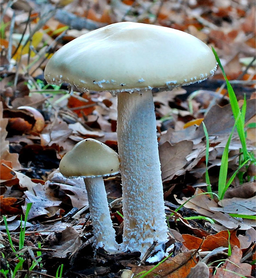 Stipe 7-17 cm long, 1-2 cm thick, equal to tapering downwards, stuffed when young, becoming hollow at maturity; white, silky at apex, floccose scales from the base to the veil, sometimes becoming smooth in age; veil cottony forming an evanescent superior annulus or annular zone; white rhizomorphs typically at the base.