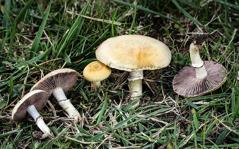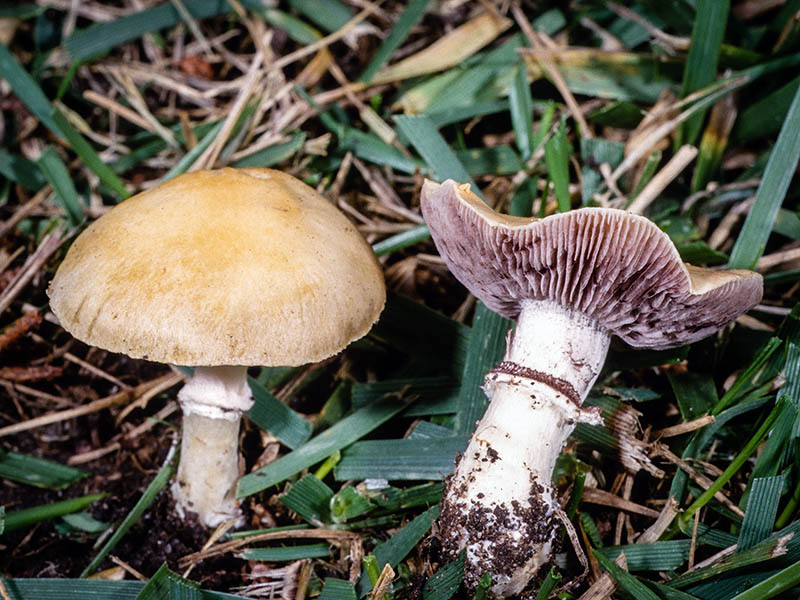 Stipe 1.5-4.5 cm tall, 4-7 mm thick, solid, stuffed at maturity, sometimes hollow at the apex, equal to tapering downward; surface finely tomentose and white above the ring, smooth to finely fibrillose and pale yellowish-buff below; partial veil white, forming a medial to superior, persistent ring, the upper surface conspicuously striate and colored purple-brown by spores; rhizomorphs frequently at the base.