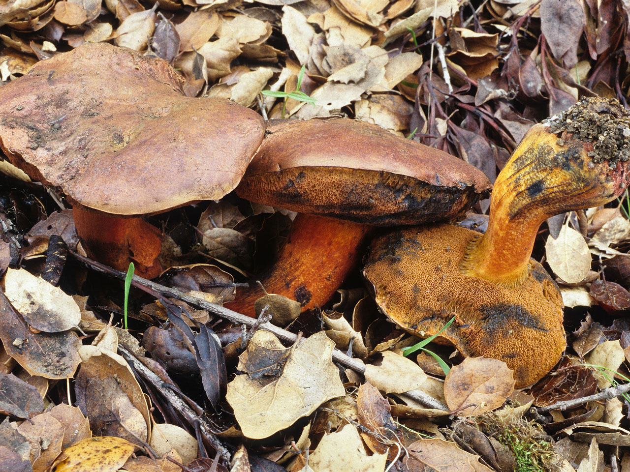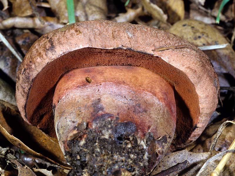 Tubes depressed near stipe; pores rusty-red when young, becoming apricot-red at maturity, quickly bruising blue.
