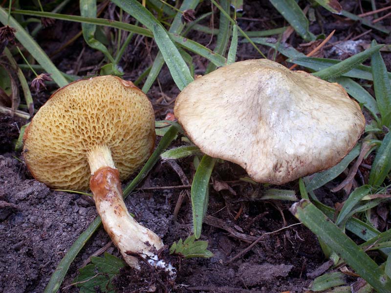 Suillus umbonatus is among the drabbest, least conspicuous of our local slippery jacks. It is recognized by a viscid, buff to pale olive-grey cap often with reddish-brown streaks, ochraceous tubes that do not discolor, and a viscid brownish annulus. Despite the species name, the presence of an umbonate cap is not a consistent character and may be lacking in some collections.