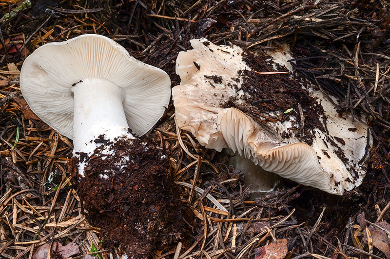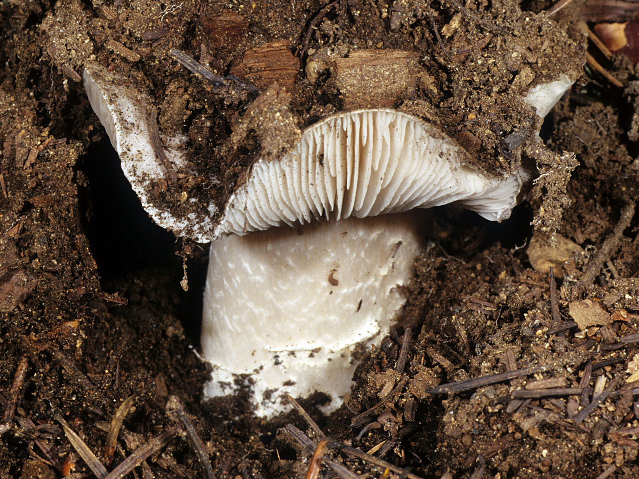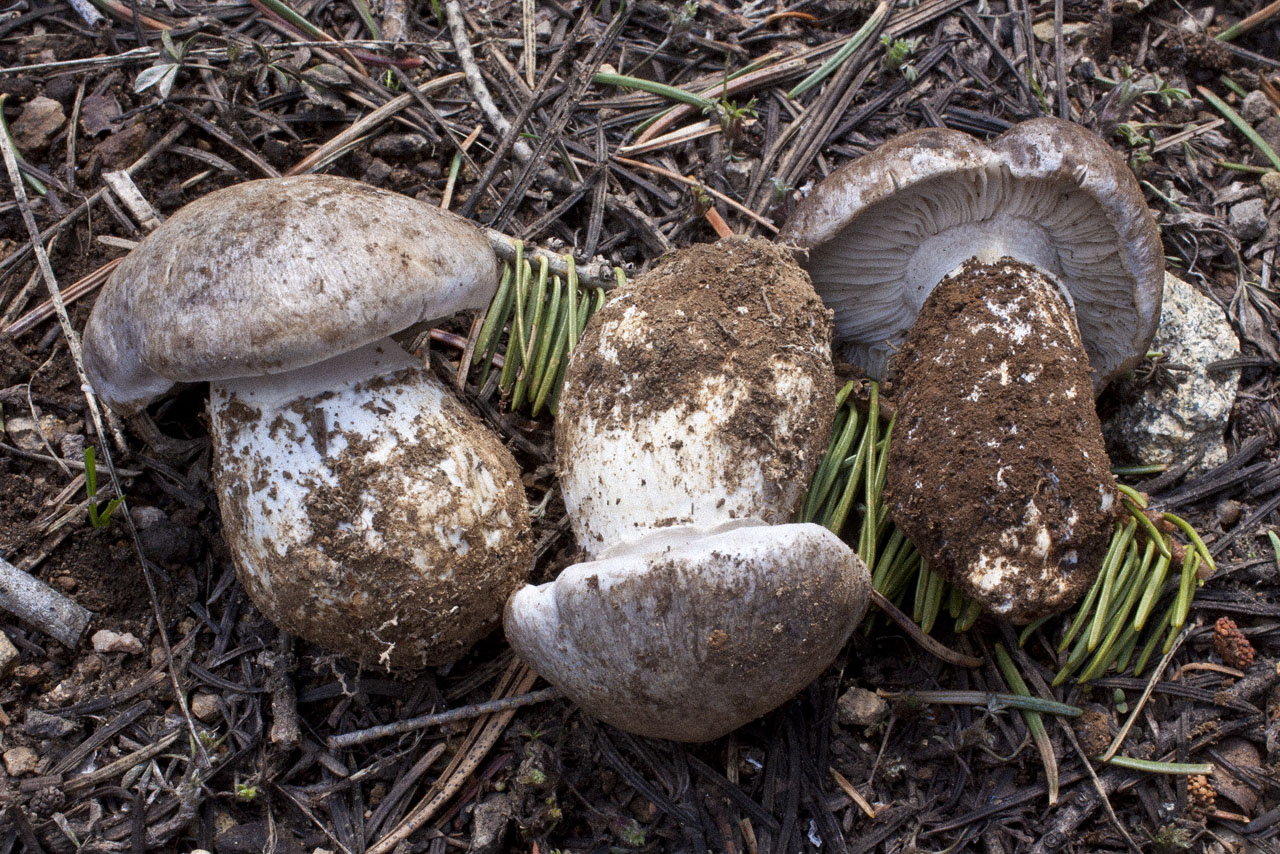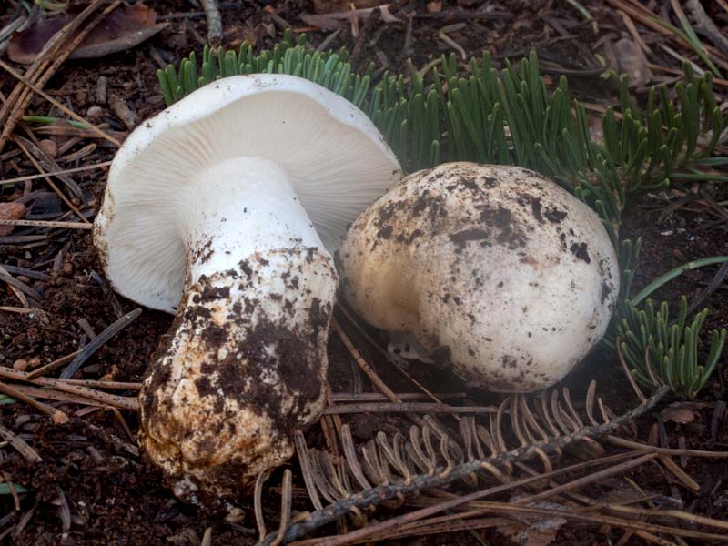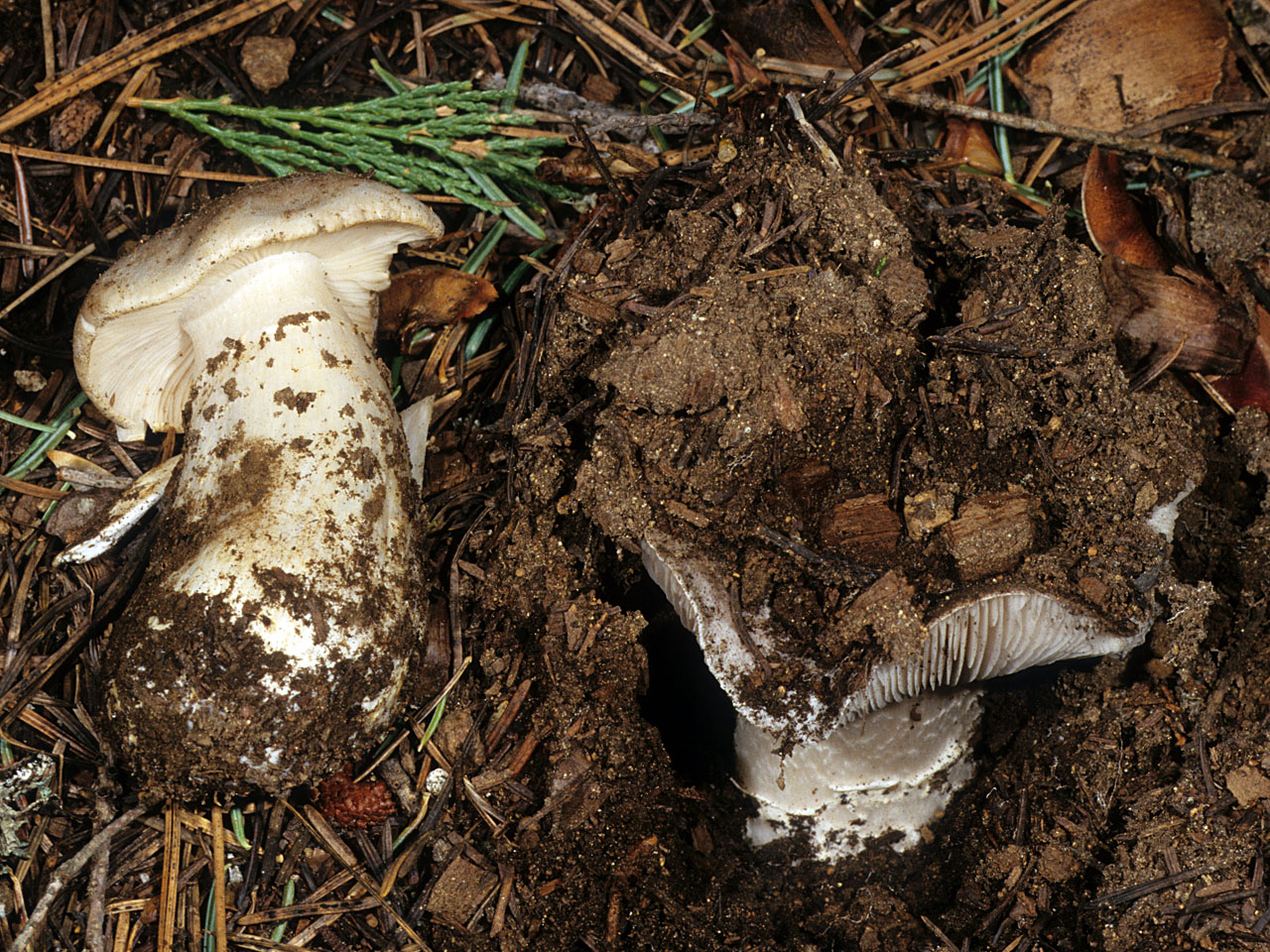 Tricholoma vernaticum is recognized as much by a strong raw potato odor as its macroscopic features, i.e. a robust stature, greyish appressed-fibrillose cap, and stipe with an inconspicuous ring. Montane mushroom hunters often find this spring species while excavating duff mounds for King Boletes. Not the prettiest of mushrooms, the drab appearance of Tricholoma vernaticum is not helped by the dirt that frequently adheres to its surface. Tricholoma vernaticum is sometimes confused with Tricholoma saponaceum. The latter, however, has a glabrous, variably-colored cap, a mixture of greys, yellows, and olives, a soapy odor, and a pointed pinkish stipe base. Another spring Tricholoma, but not likely to be confused with Tricholoma vernaticum because of size, is Tricholoma moseri. A diminutive mushroom, it has a dark-grey, squamulose cap, greyish rather than cream-colored gills, and lacks a potato/cucumber odor and ring