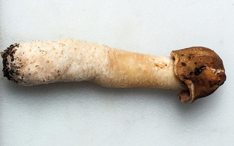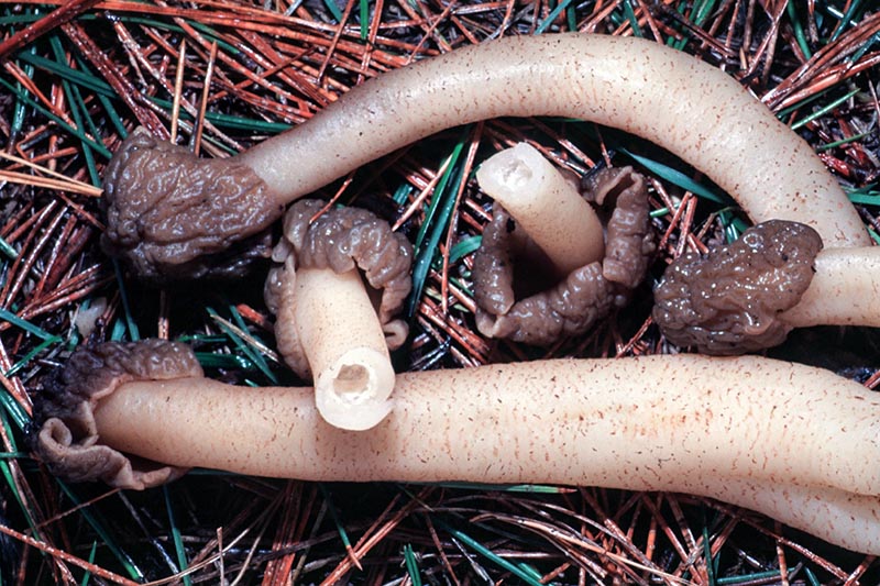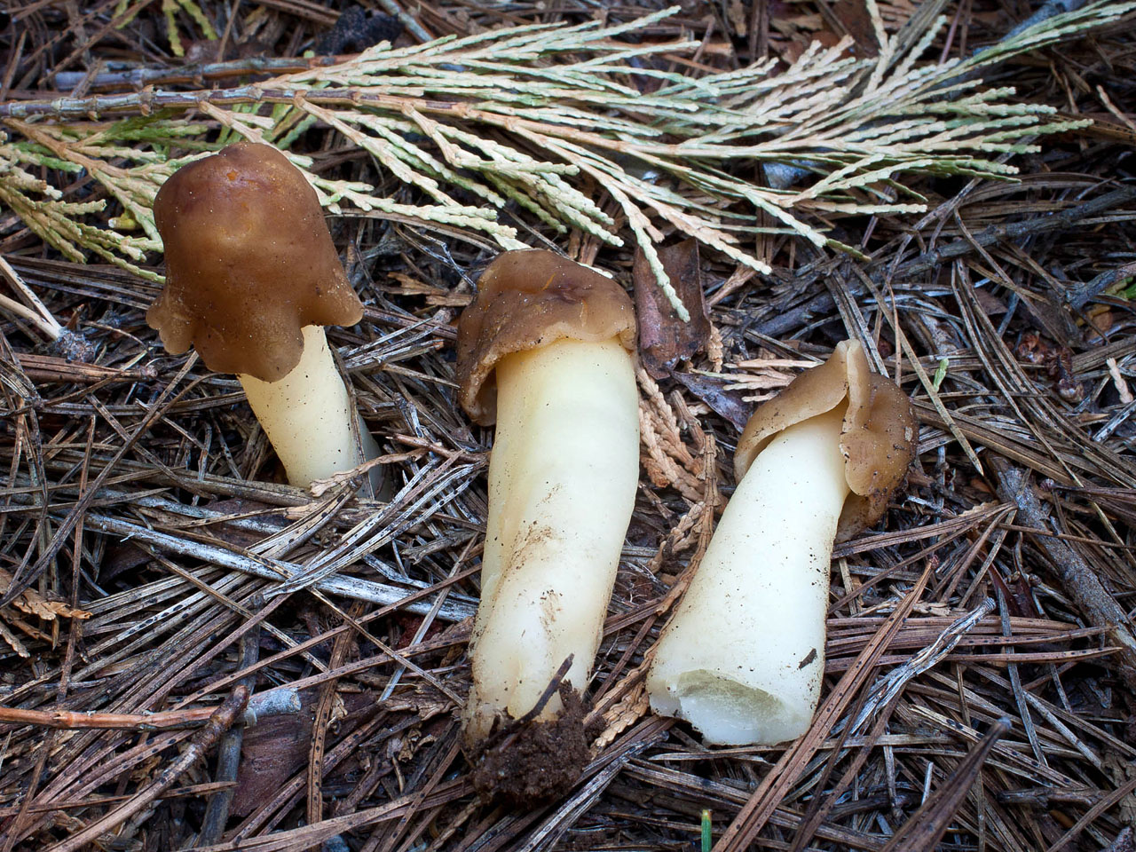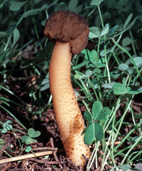 Distinguishing features of this Ascomycete include a brown to ochraceous-brown conic cap, often with a wavy margin, a pileus attached only at the stipe apex, and a pallid stipe usually with appressed, pale ochraceous scales. Another species, Verpa bohemica has a distinctive wrinkled cap and is sometimes confused with distantly related morels (Morchella spp.) which have pitted/ridged caps. Indeed, Verpa bohemica is sometimes sold in markets under the name "Spring Morel" or "Early Morel," though it lacks both the texture and flavor of true morels (Morchella spp.). Morels, (except for Morchella semilibera) can easily be told from Verpa bohemica by a cap margin that is fused (not free) to the stipe. The exception to the rule, Morchella semilibera, has a cap that is fused approximately halfway to the apex.