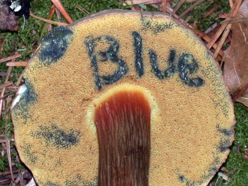 Pores +/- 1 per mm, dull yellow to yellowish-green, bruising rapidly blue; tubes up to 1.5 cm long, narrowly depressed near stipe, yellowish-green, quickly and strongly bruising blue.
