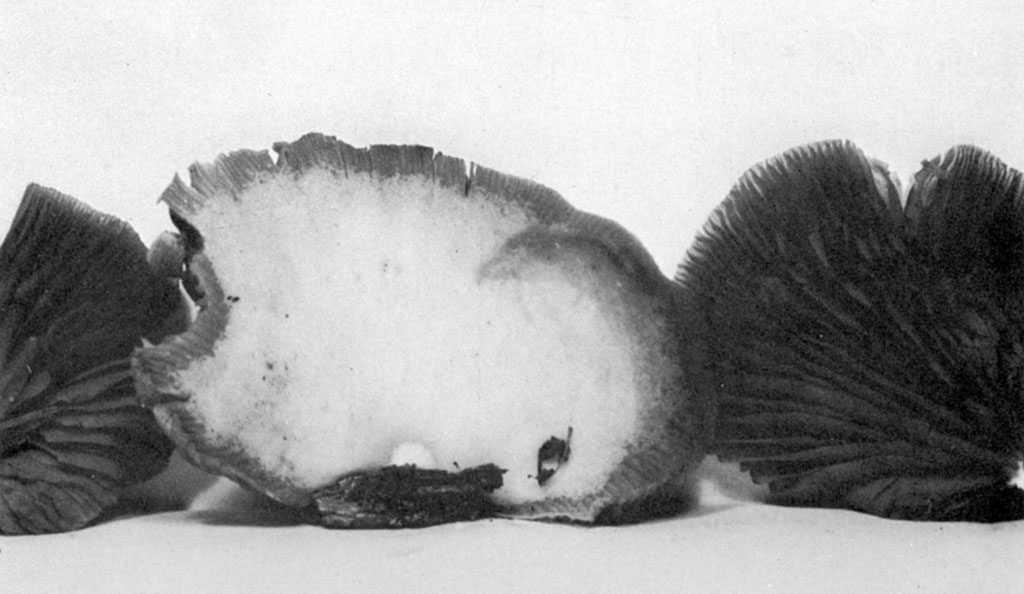 Pileus 1.5-6 cm latus, sessilis, albus demum pallidus, hygrophanus, deinde alutaceus vel coriaceus, glabrosus vel tomentosus. Odore mitis, gustu mox amarus vel stypticus. Lamellae confertae, medio-latae demum latae, albae, deinde obscuro-"clay color." Sporae 5-7.5 µ, globosae, punctatae. Basidia 24-36 x (6) 7-9 (12) µ, di- et tetraspora. Pleurocystidia (24)35-62 x 5-12 µ; cheilocystidia 24-48 (55) x 5-11 µ. Cuticula ex hyphis repentibus composita. Fibulae adsunt. Specimen typicum in Herb. Univ. Mich.; lectum prope Colonial Point Hardwoods, Michigan, July 22, 1963, A. H. Smith 66854.