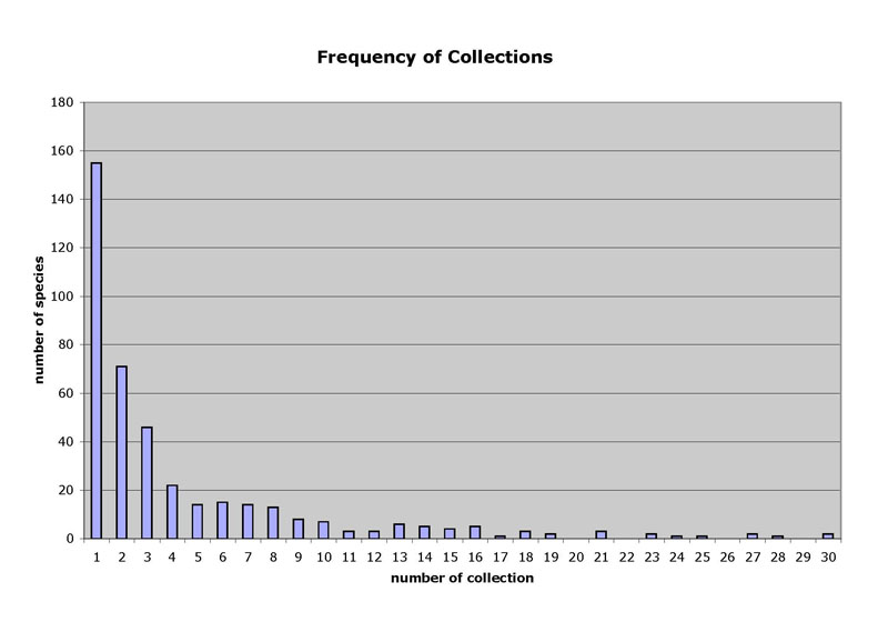 The species frequency graph shows that almost of third of the species were collected at only one time (i.e., one foray) and on a single collecting route, and the majority of species were collected at three or fewer routes and times. This means that many of the species are fairly localized in space or time, or that few collectors happen to notice or collect them. A small number of species were collected on many routes on all the forays. You can see a list of the fifty most common species here